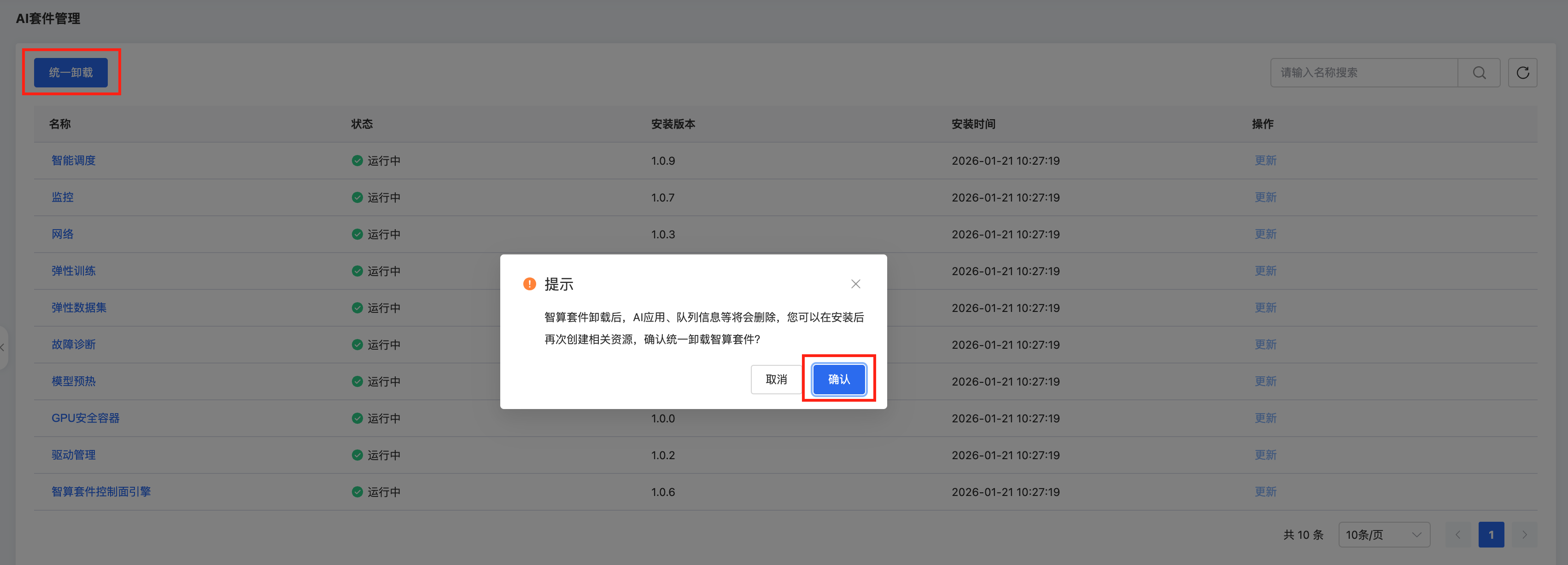 智算套件卸载后,AI应用、队列信息等将会删除。您可用在安装后再次创建相关资源。