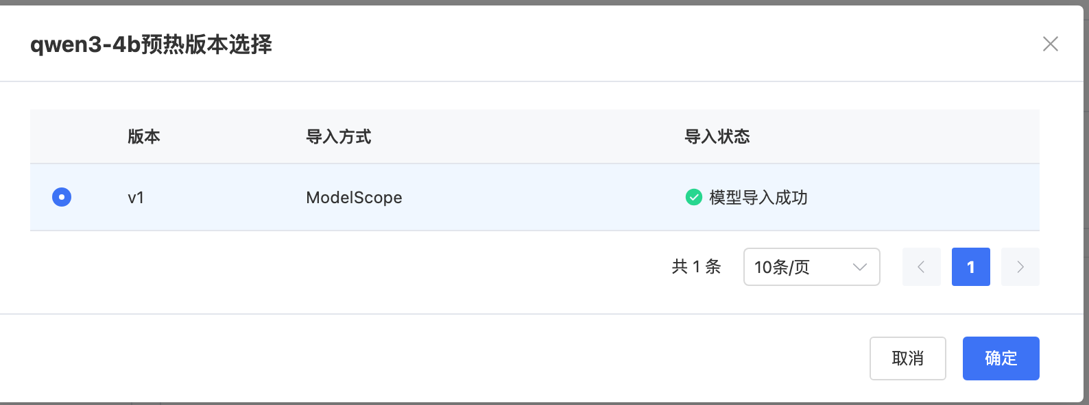 二、选择要预热的模型,点击 预热。选择要预热的 模型版本,点击 确定。