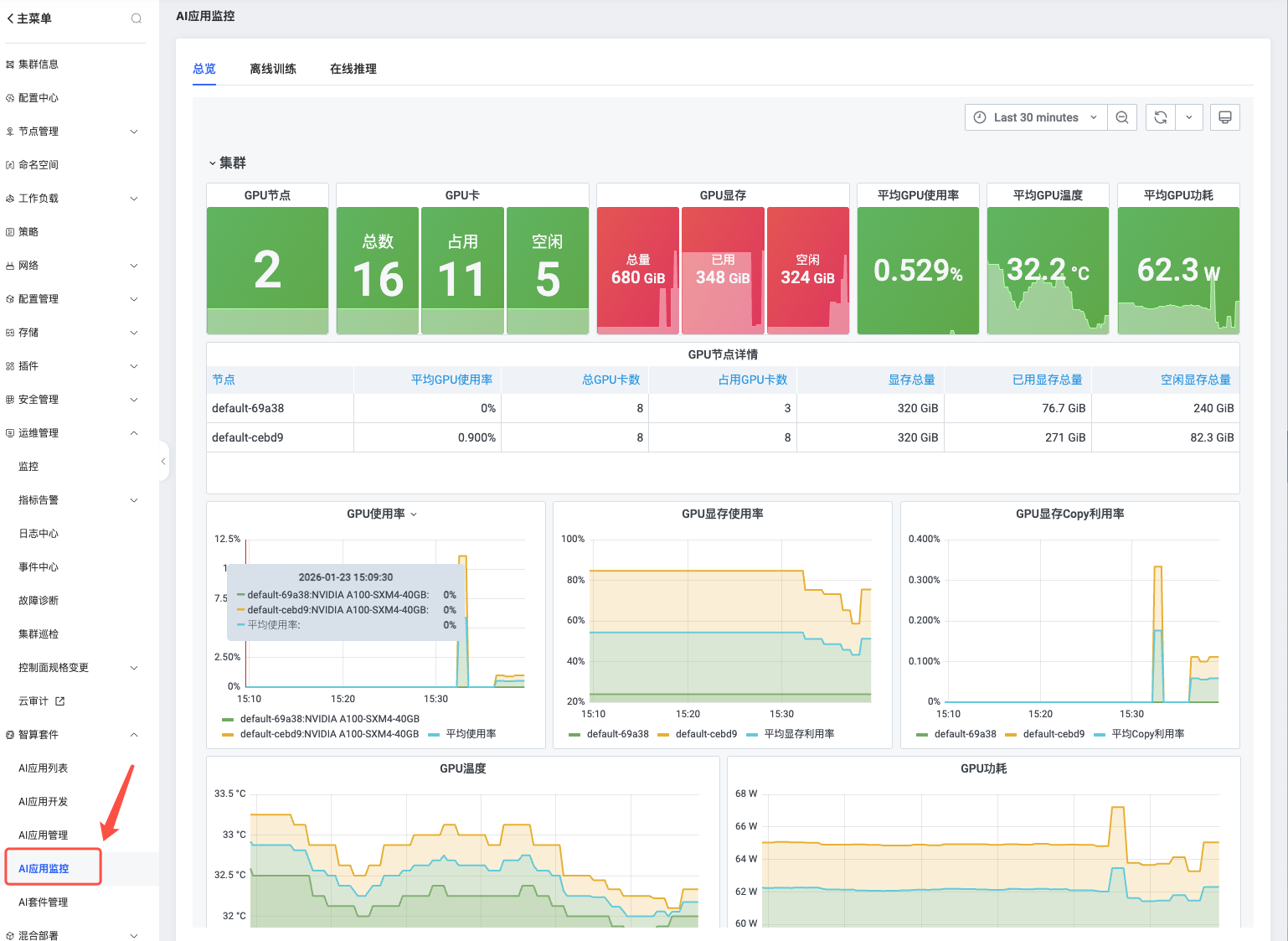 点击AI应用监控,查看监控总览,包括集群、在线推理、离线训练等不同维度的监控。