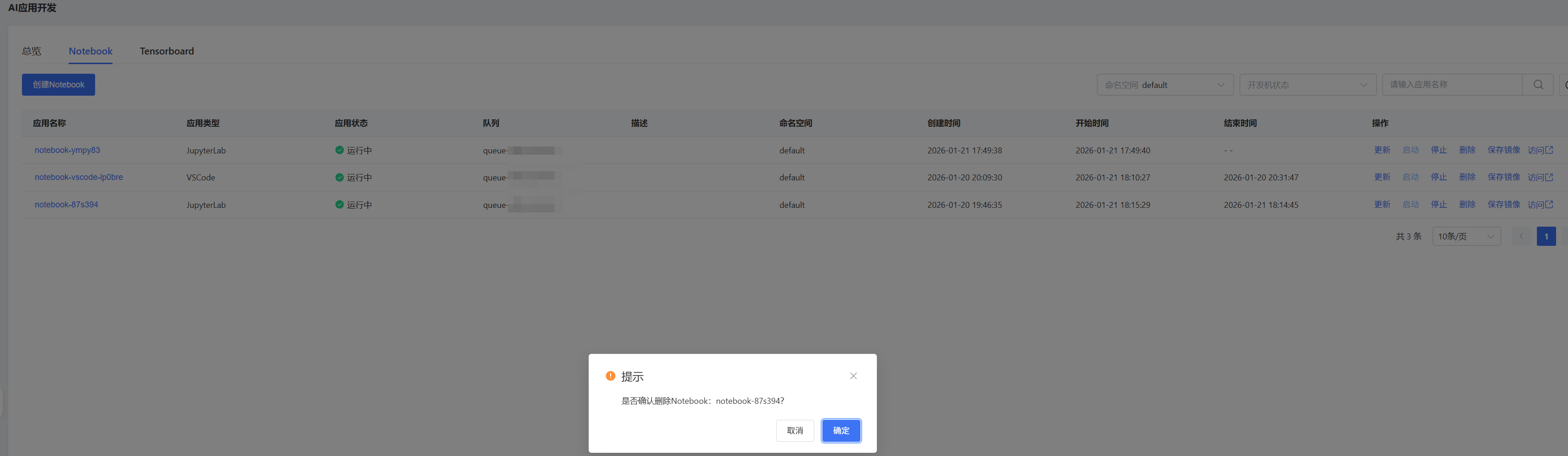 | 停止 | 开发机已停止,停止实例后未保存到持久化存储中的数据将丢失 |