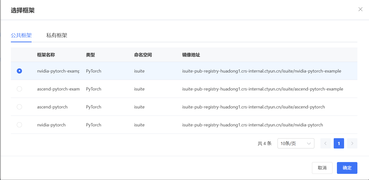 4. 选择框架,这里会根据选择的任务类型筛选出所有对应的框架镜像