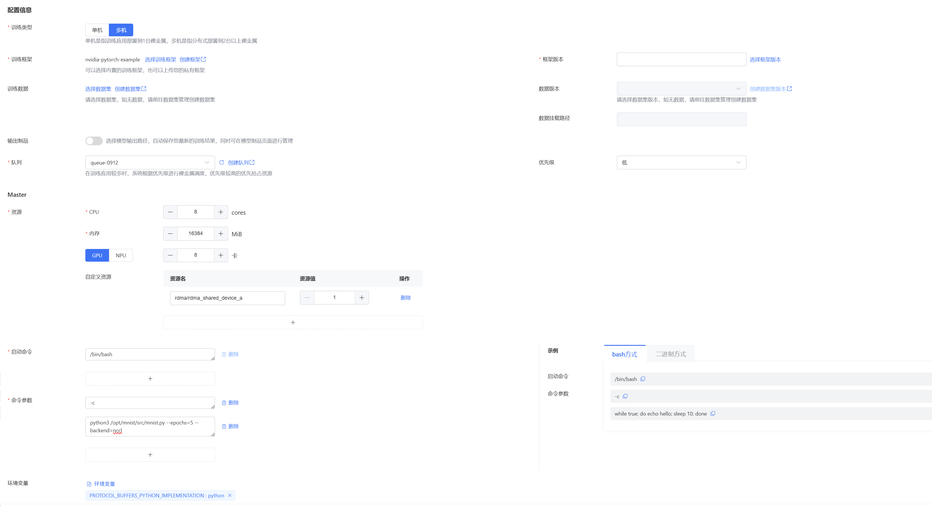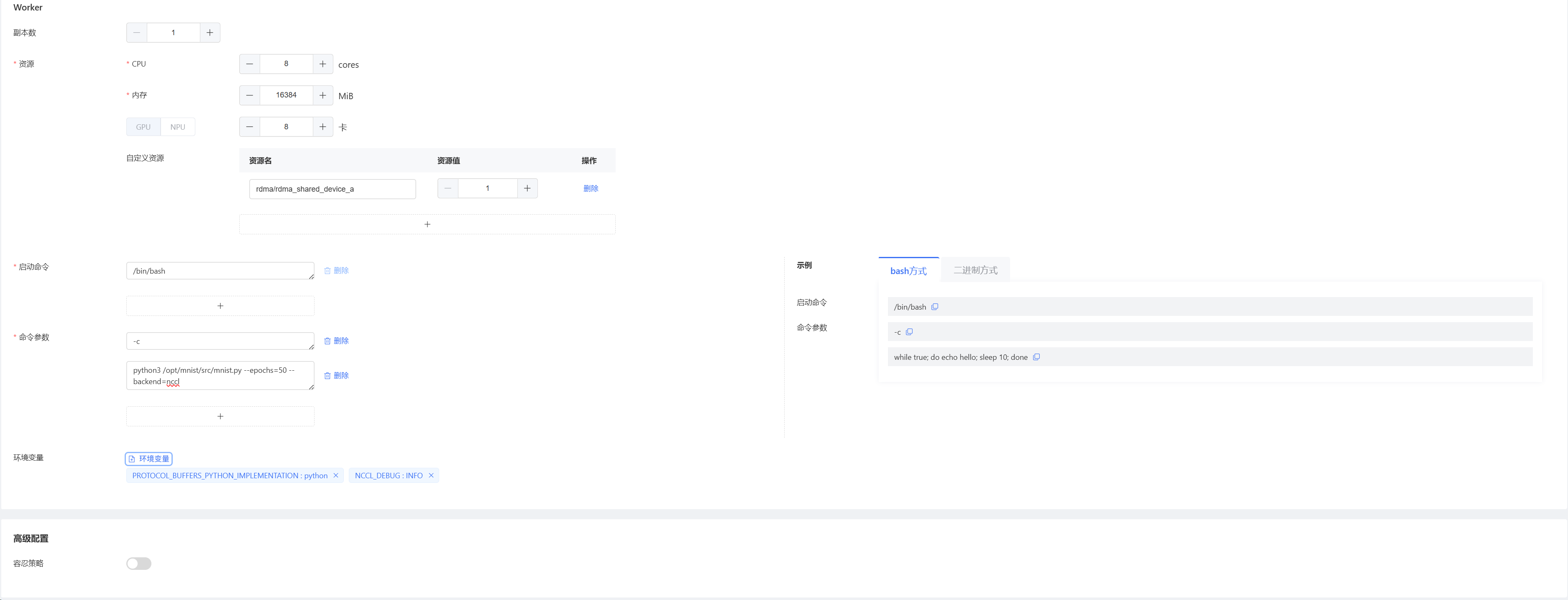 8. 配置Worker资源及启动参数等信息,如果需要使用RDMA加速训练则将RDMA资源通过自定义方式进行挂载