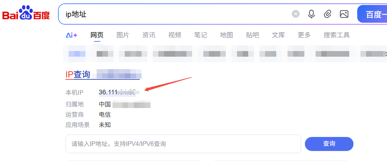 获取本机出口IP方式可通过百度搜索“ip地址”进行查询。