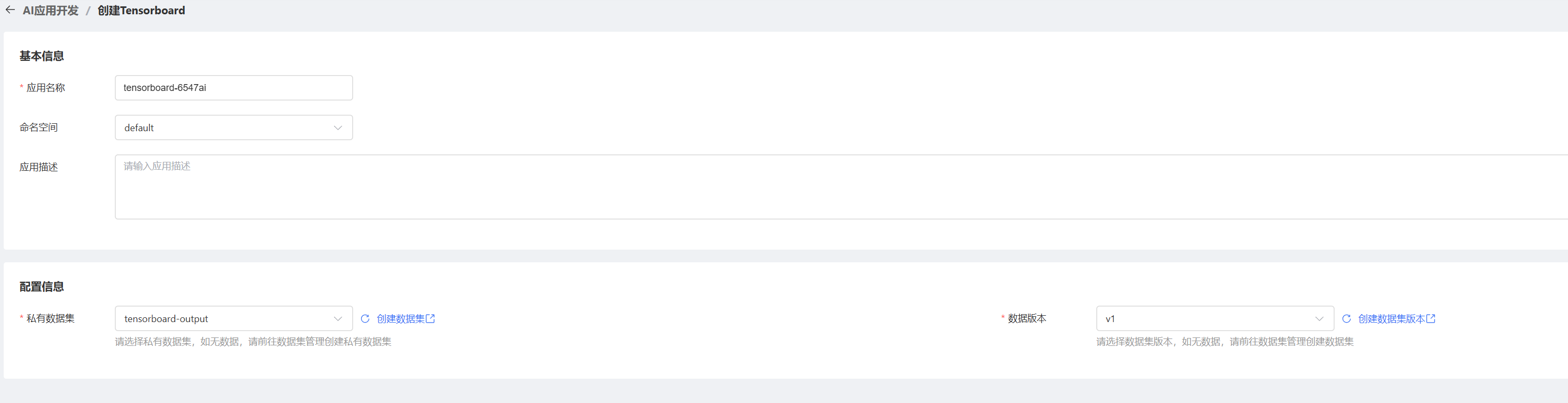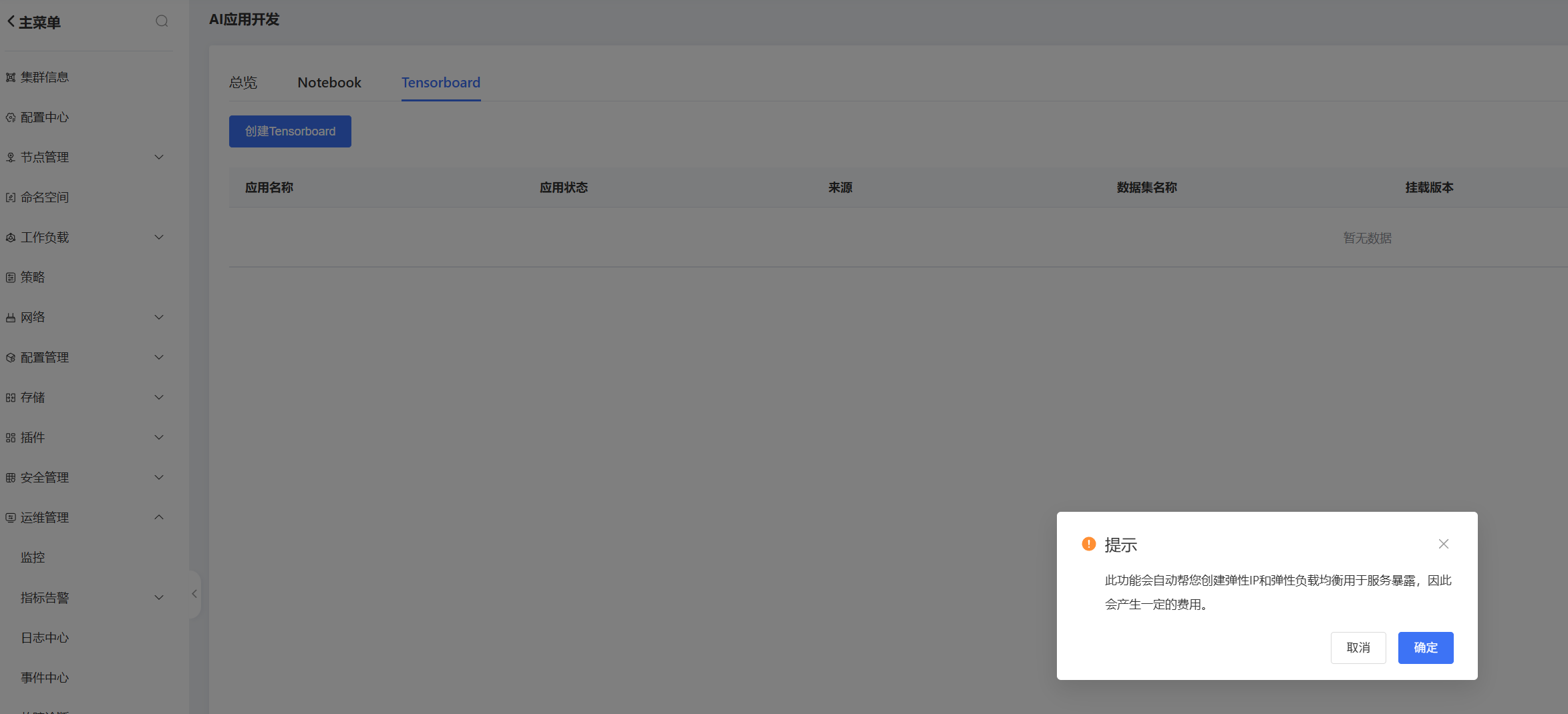 在智算套件控制台页面选择“AI应用开发”,单击“创建Tensorboard”。