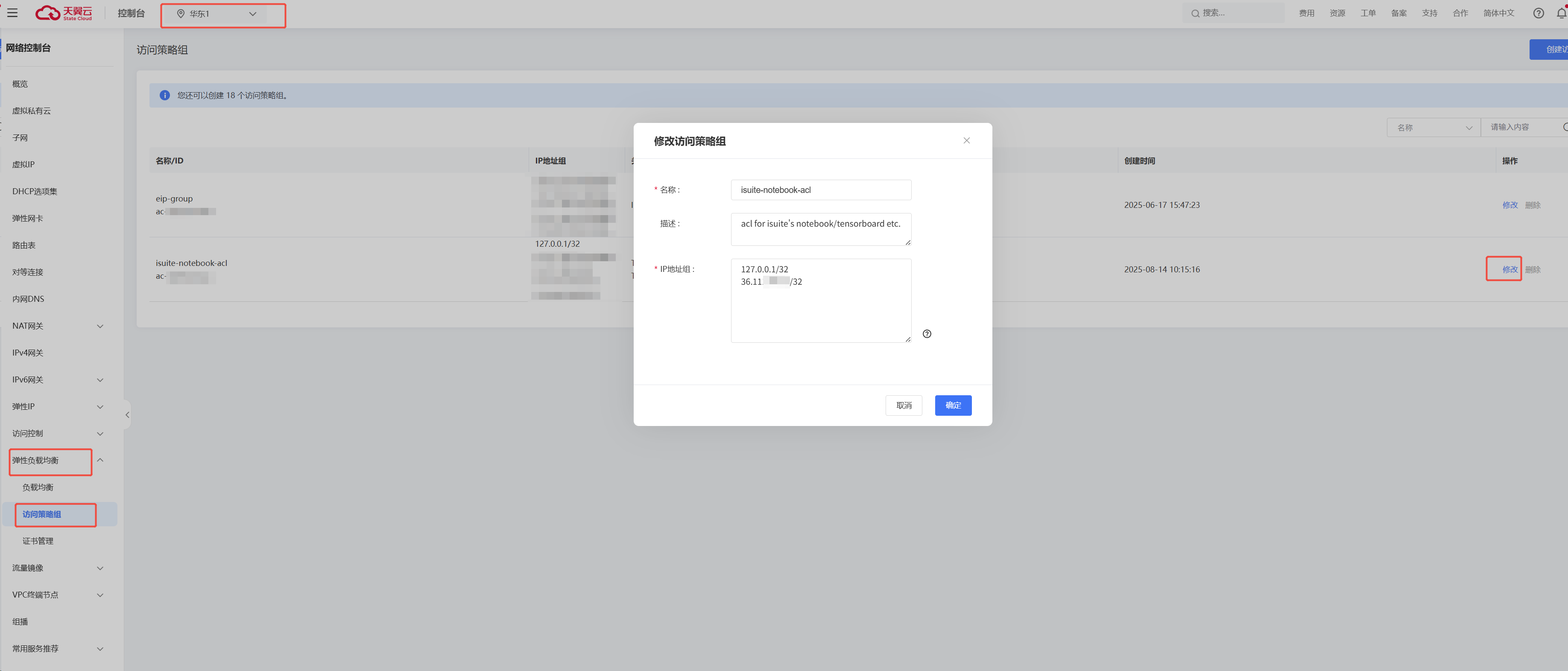 等待新建开发机的“访问”按钮可点击后,访问提示信息中的链接,先选择资源池信息,然后配置“弹性负载均衡->访问策略组”,修改isuite-notebook-acl策略组的配置(默认只放开了127.0.0.1地址),需要增加本地客户端的出口IP配置。