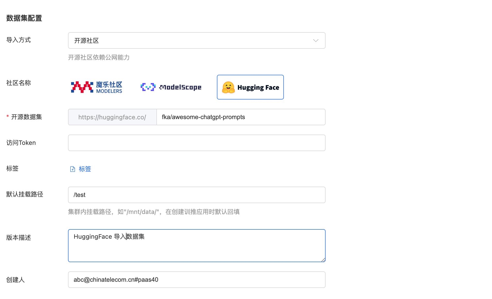 2、进行数据集导入配置,选择开源社区类型导入方式,社区名称选择Hugging Face,开源数据集粘贴刚复制的数据集名称,若为私有数据集,则需要填写访问Token