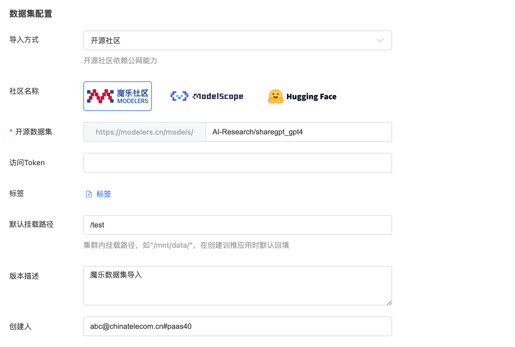 2、进行数据集导入配置,选择开源社区类型导入方式,社区名称选择魔乐社区,开源数据集粘贴刚复制的数据集名称,若为私有数据集,则需要填写访问Token(从个人中心-访问令牌获取)