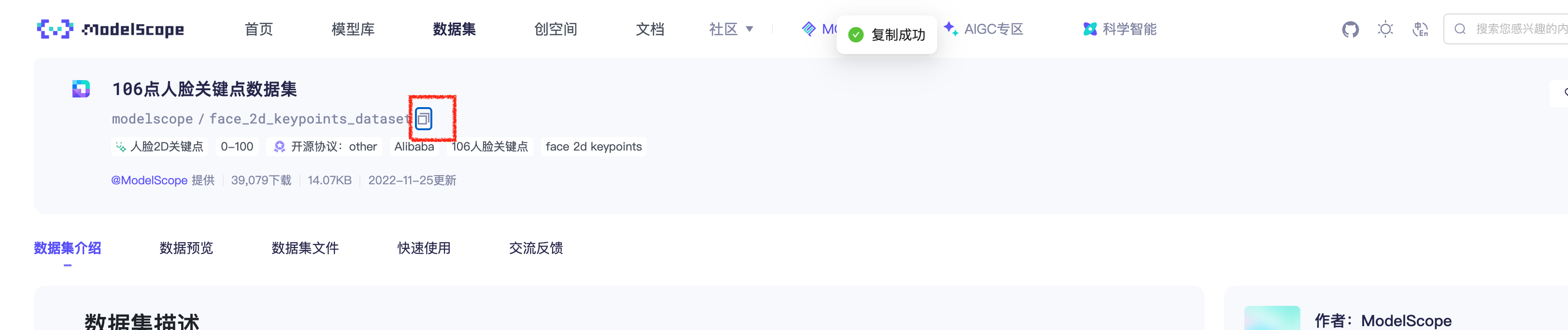 1、在魔搭社区官网复制需要导入的数据集名称