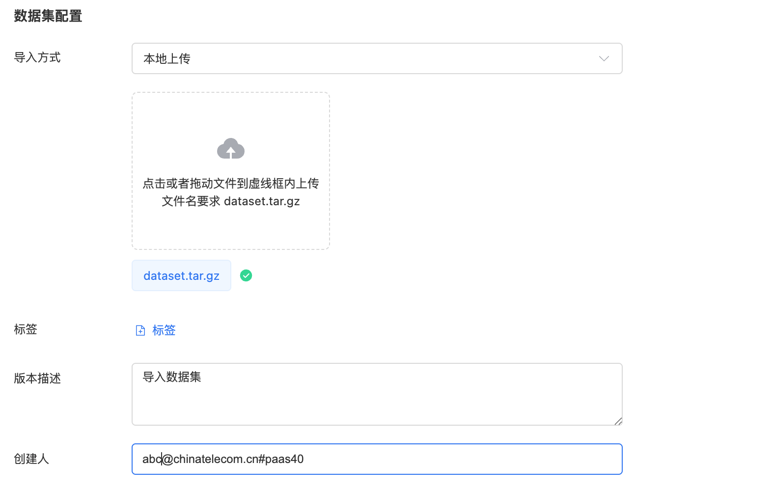 2、点击虚线矩形框处,选择需要上传的数据集压缩文件 dataset.tar.gz,当进度条为100%,即上传成功,然后点击提交按钮。