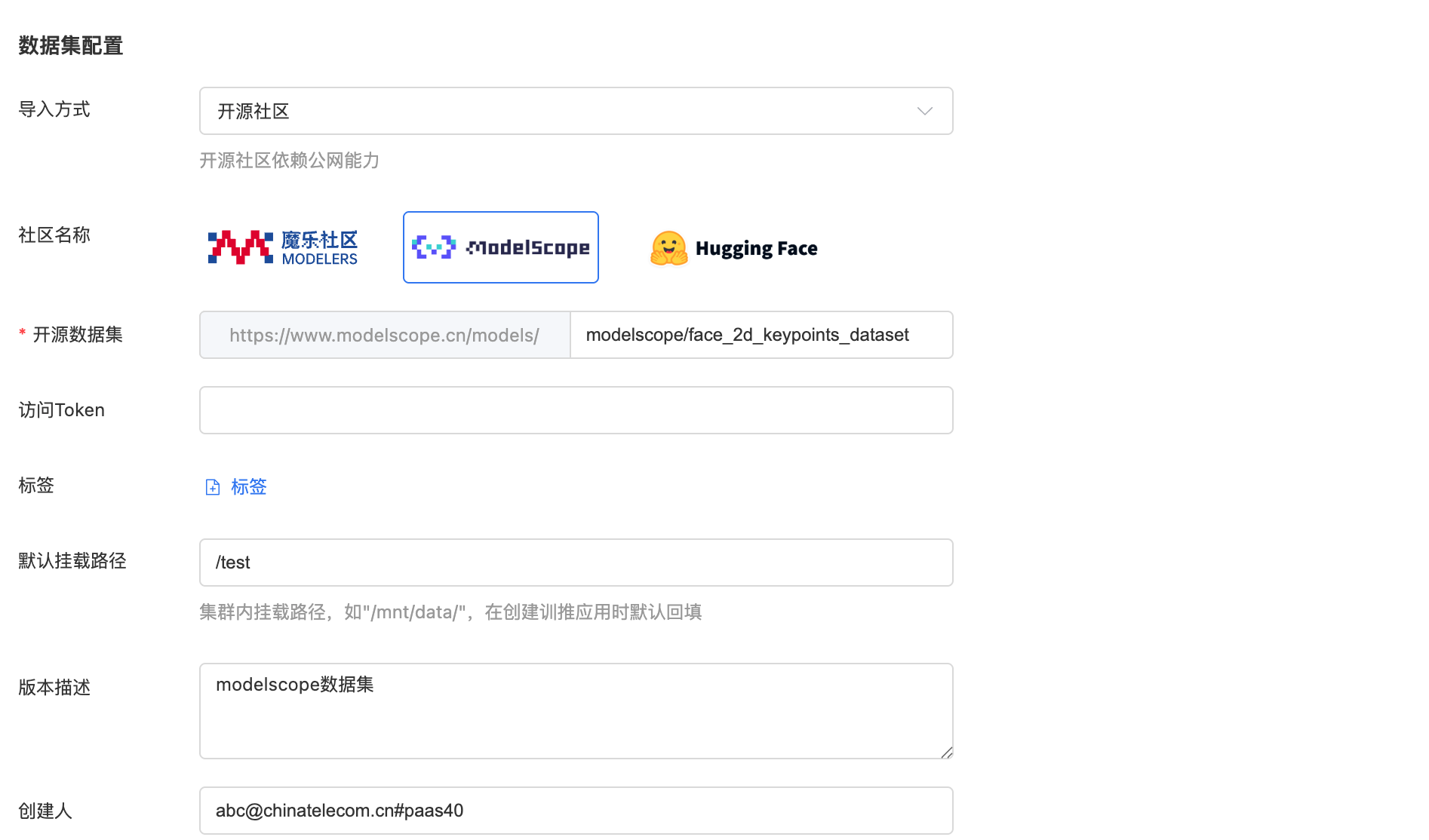 2、进行数据集导入配置,选择开源社区类型导入方式,社区名称选择ModelScope,开源数据集粘贴刚复制的数据集名称,若为私有数据集,则需要填写访问Token