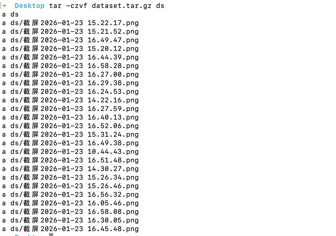 1、将本地数据集使用tar - czvf 命令打包,文件名需为dataset.tar.gz。