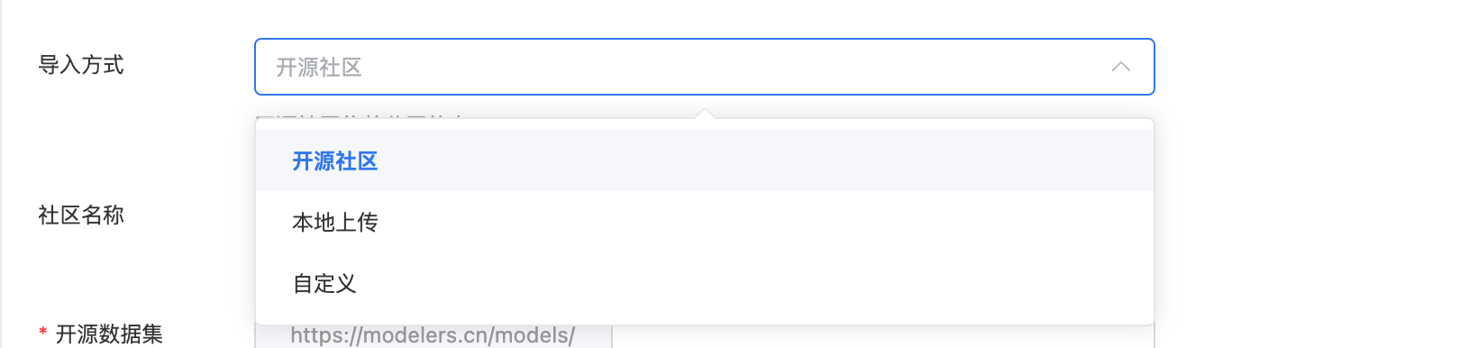 4、若需导入数据集,选择导入方式,这里有三种导入方式(开源社区、本地上传、自定义)