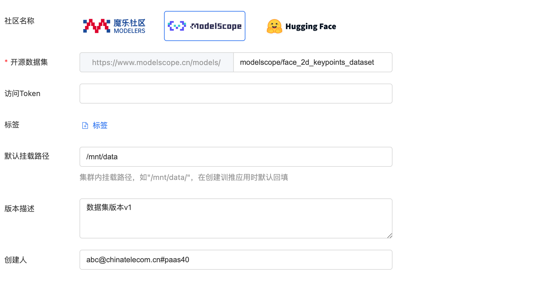 5、若选择开源社区,则依次选择社区名称,输入开源数据集名称,访问token(私有),数据集标签,默认挂在路径,版本描述和创建人,然后点击提交按钮即可