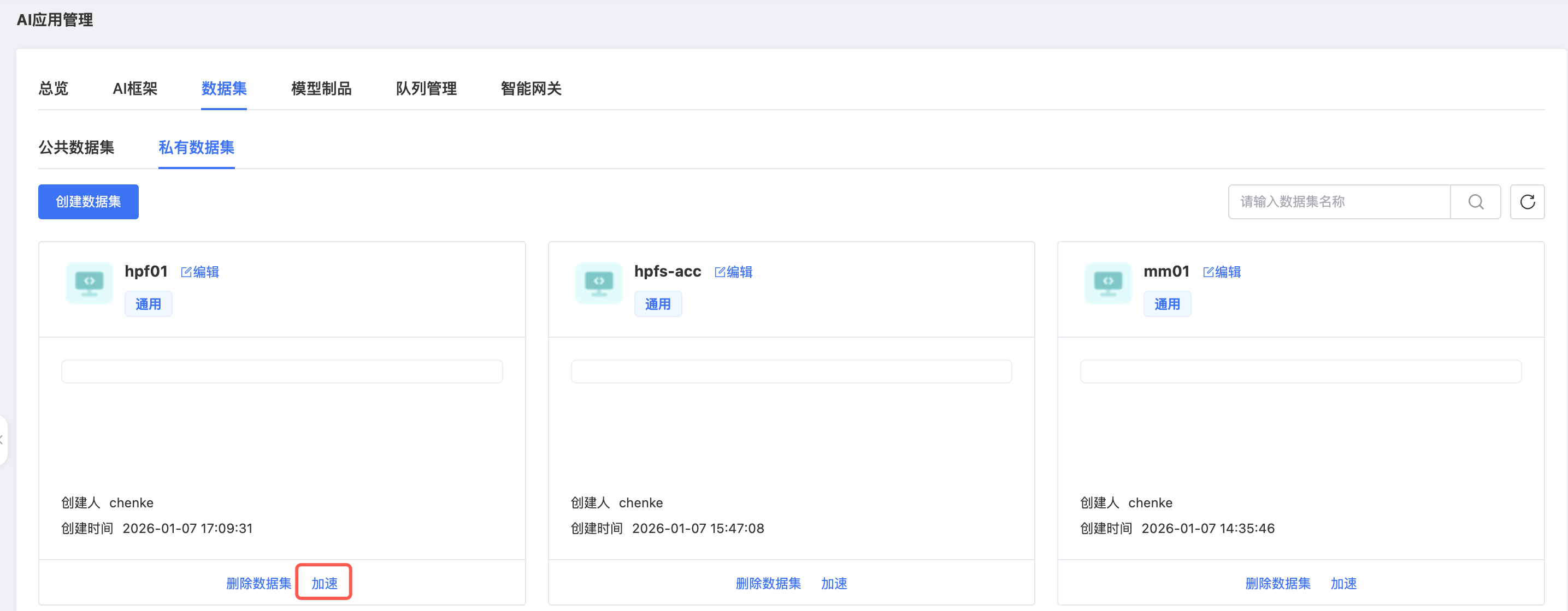 在私有数据集列表页,选择指定数据集,点击 “加速” 按钮