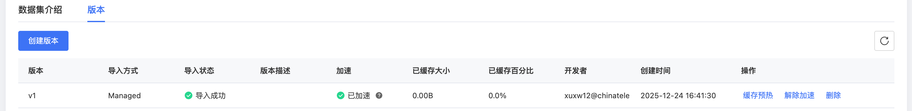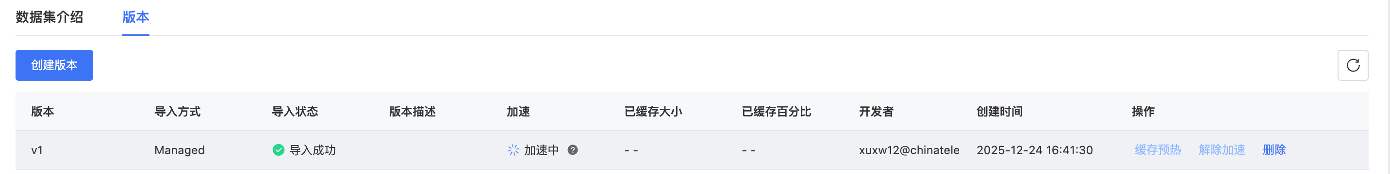 数据集开启加速后,在数据集详情页,可以查看各版本加速状态。
