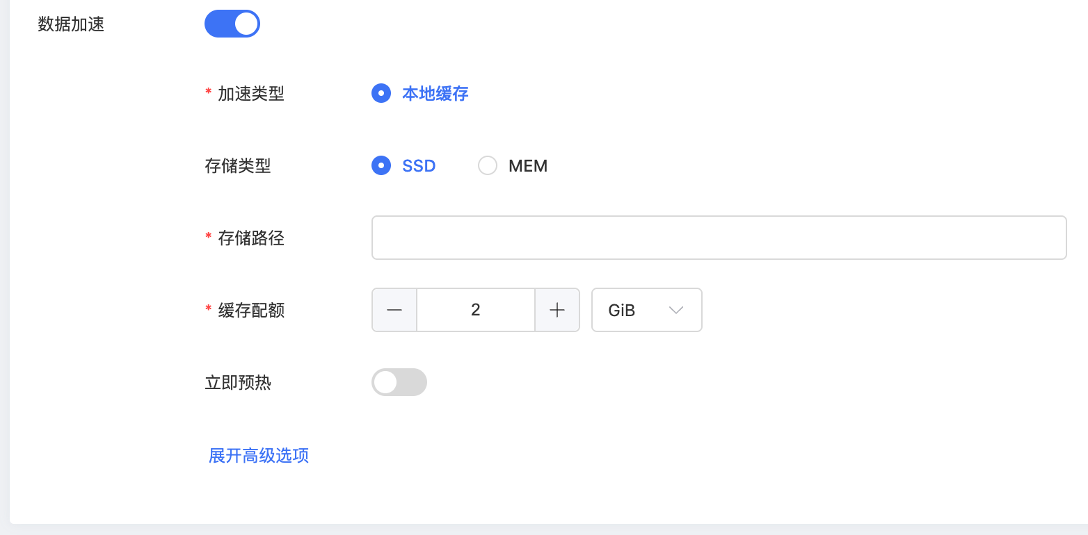 | 存储路径 | 缓存介质的本地挂载 / 存储路径 注:选择SSD存储,路径不能配置根目录,更进一步,建议不适用系统盘路径 选择MEM存储,路径开头配置为/dev/shm 或 /run/shm | |