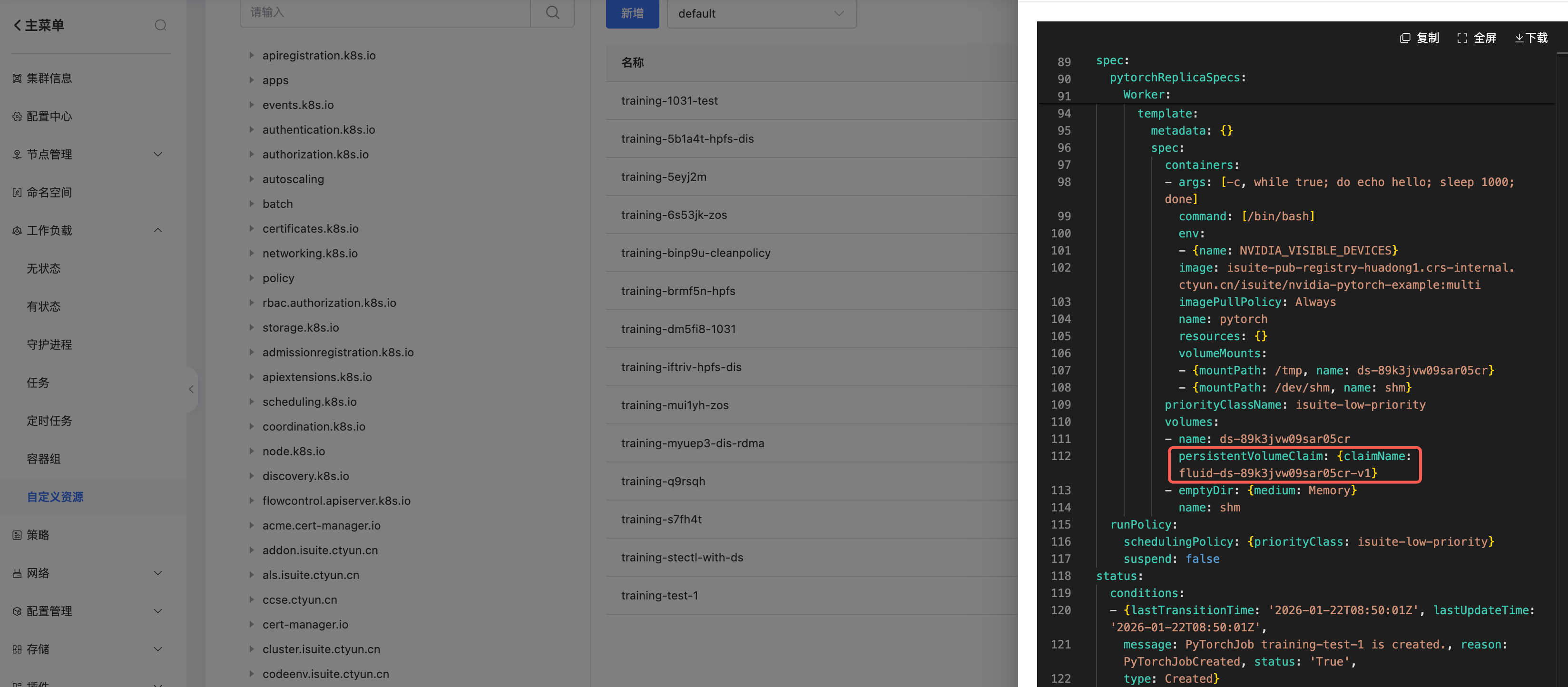 训练应用创建完成,将默认使用加速PVC。以PyTorchJob为例,可以在yaml中查看挂载信息: