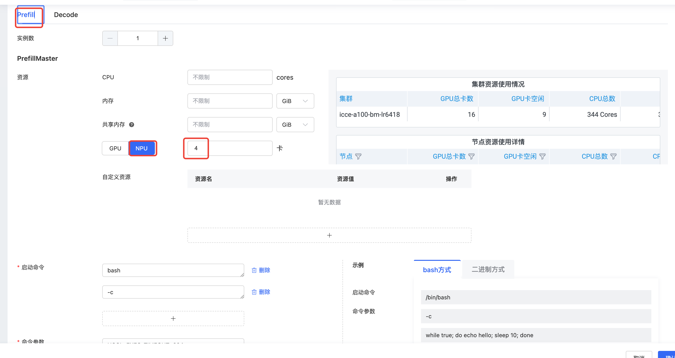 CPU,内存,共享内存不填,NPU填:4
