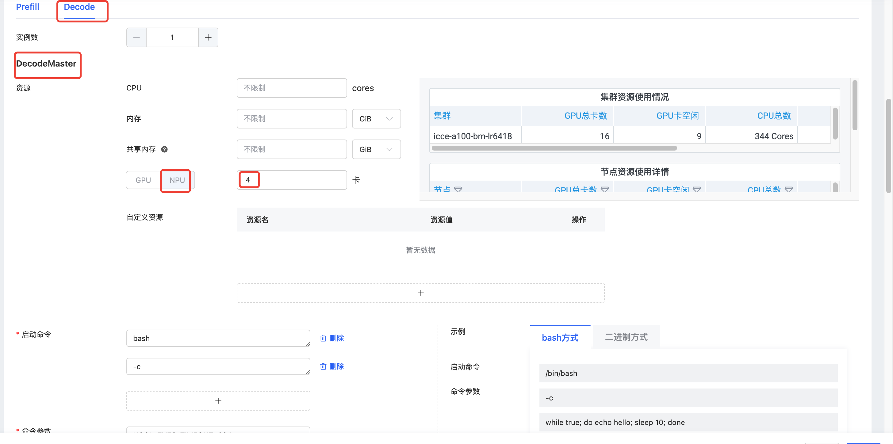 DecodeMaster 的资源菜单:CPU,内存,共享内存不填,NPU填:4