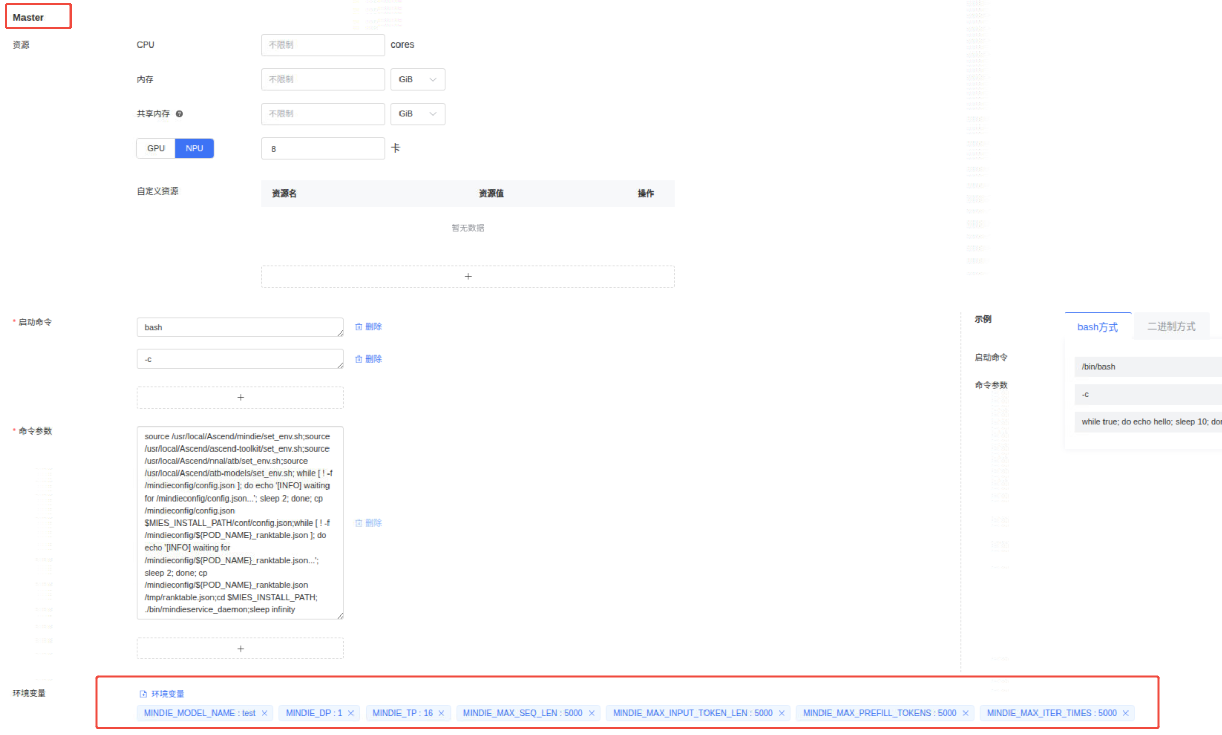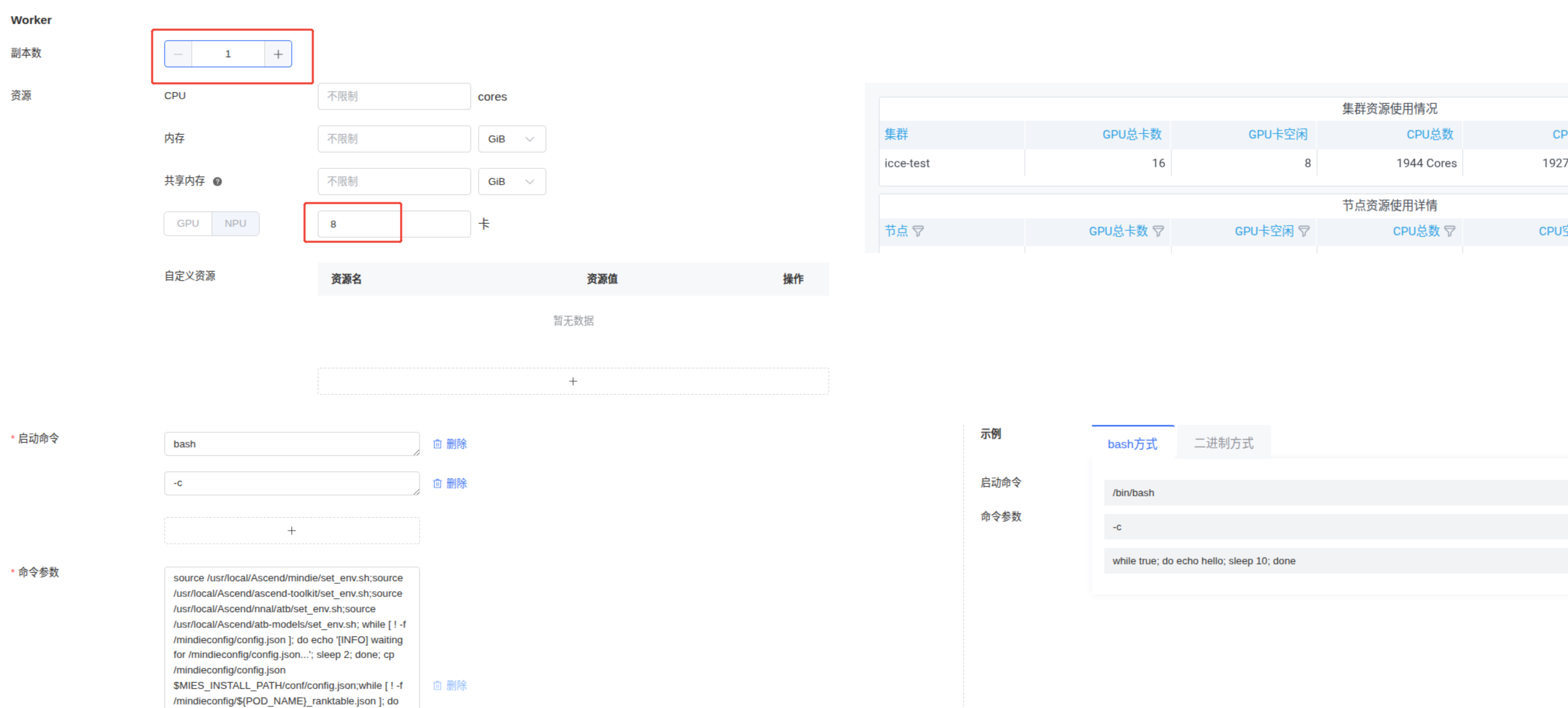 副本数 1,CPU,内存,共享内存可以不填,NPU填:8。