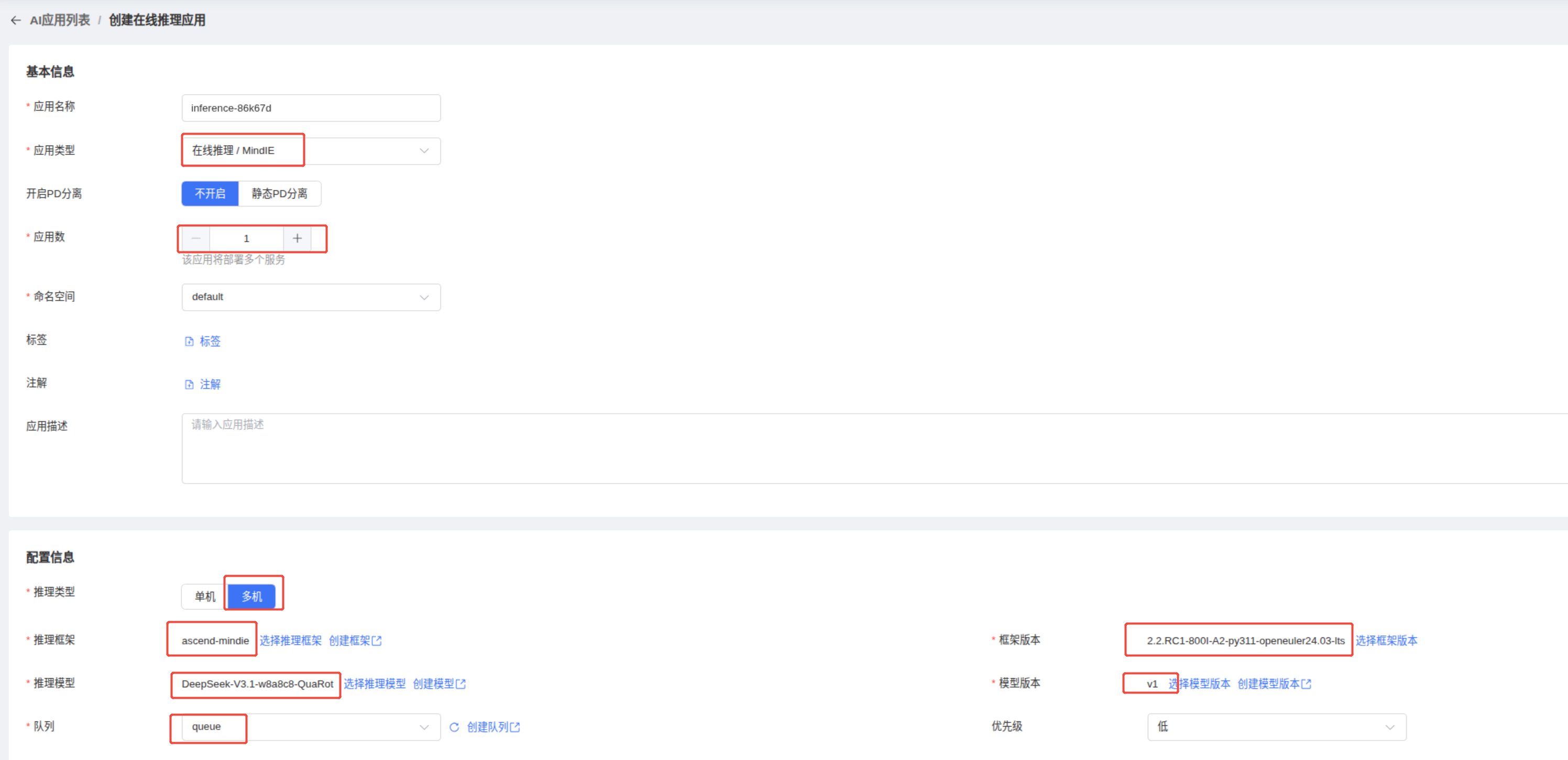 推理类型选择多机,推理框架,框架版本,推理模型,模型版本根据实际情况选择。简单的示例: