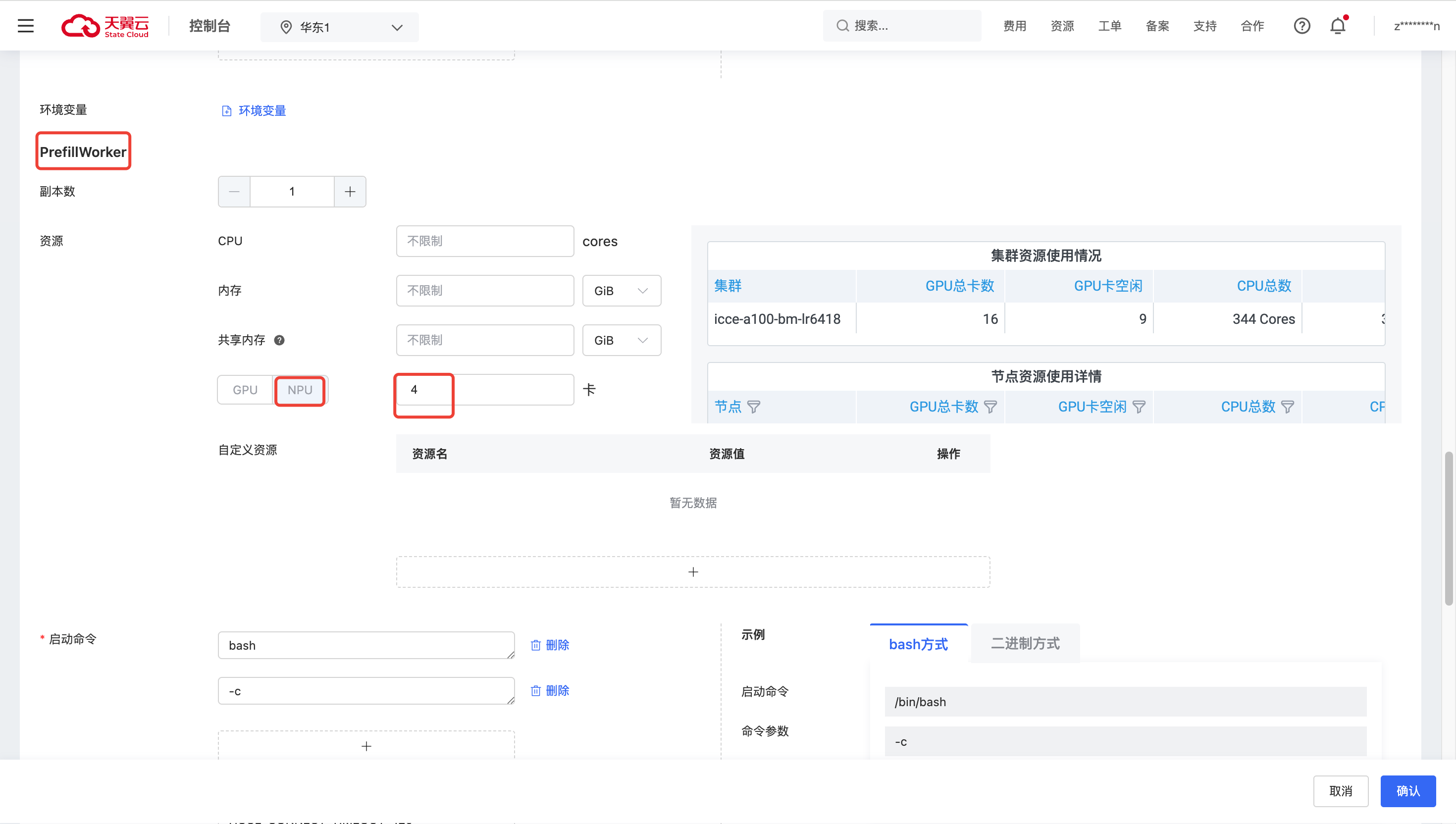 CPU,内存,共享内存不填,NPU填:4