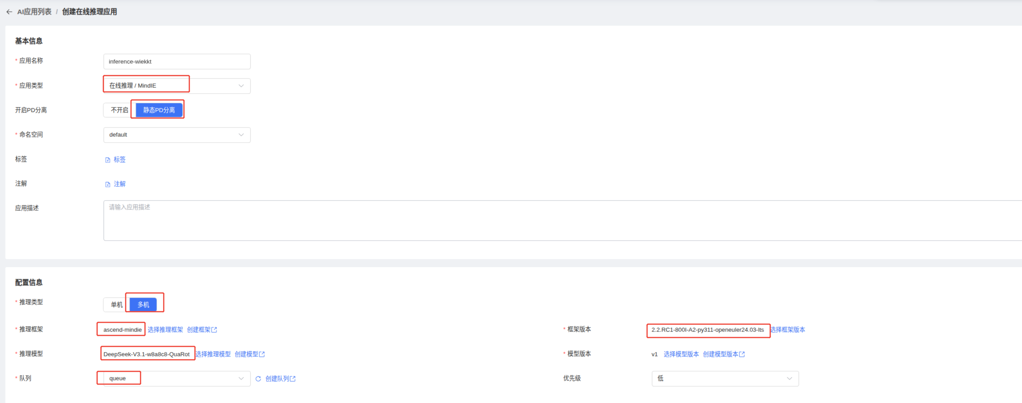 推理类型选择多机,推理框架,框架版本,推理模型,模型版本根据实际情况选择。简单的示例: