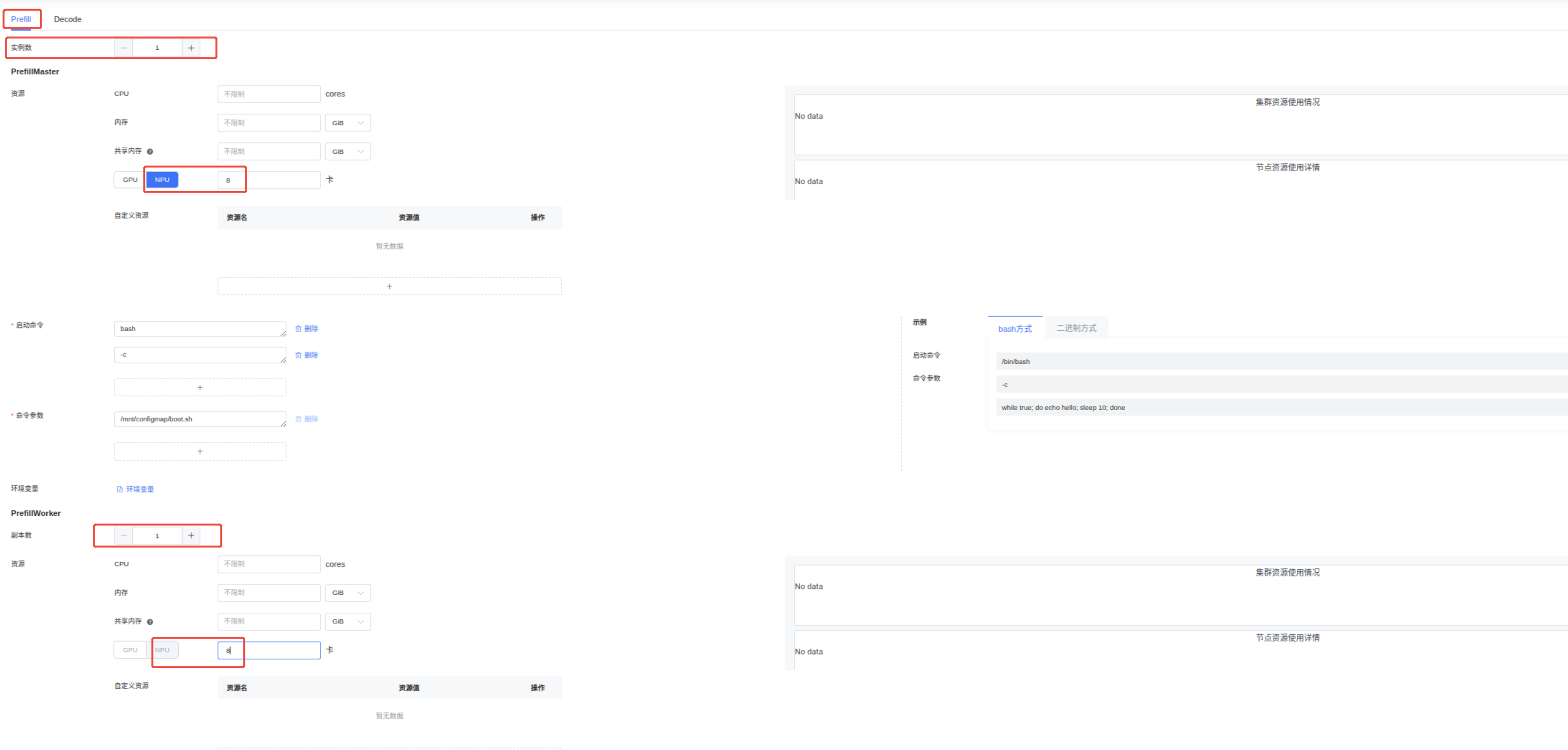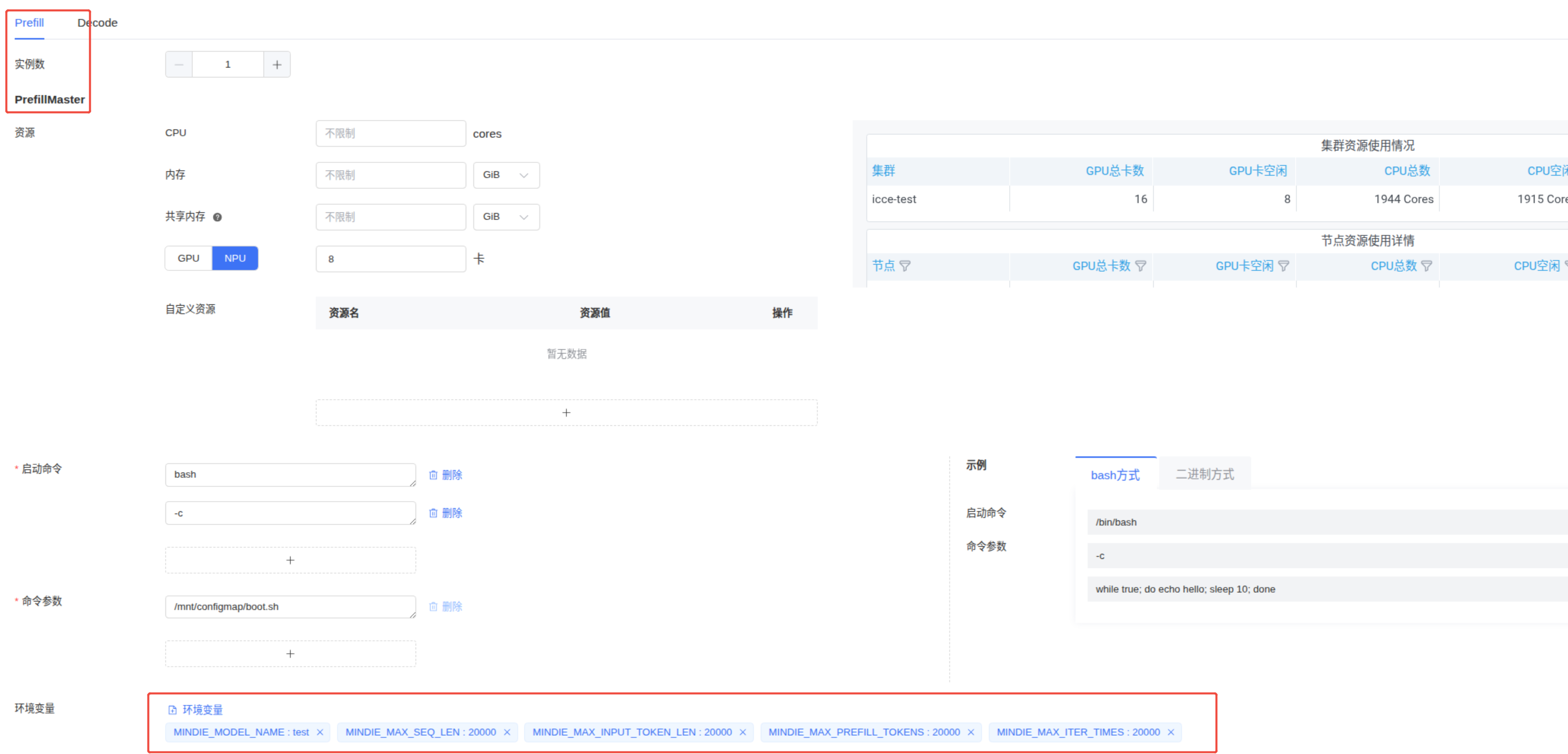 PrefillMaster 资源菜单:CPU,内存,共享内存可以不填,NPU填:8。