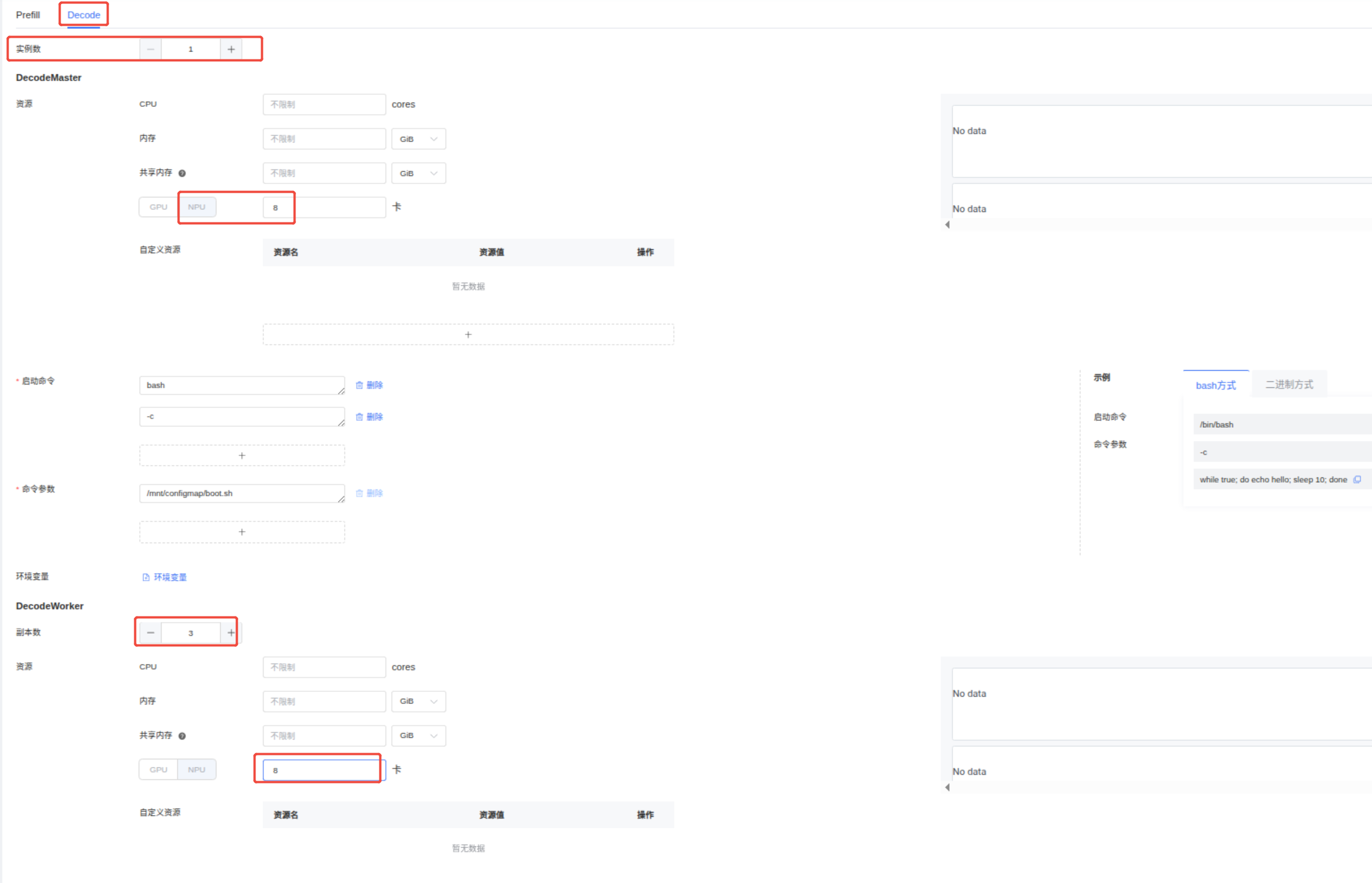 DecodeWorker 副本数:3 资源菜单:CPU,内存,共享内存可以不填,NPU填:8。