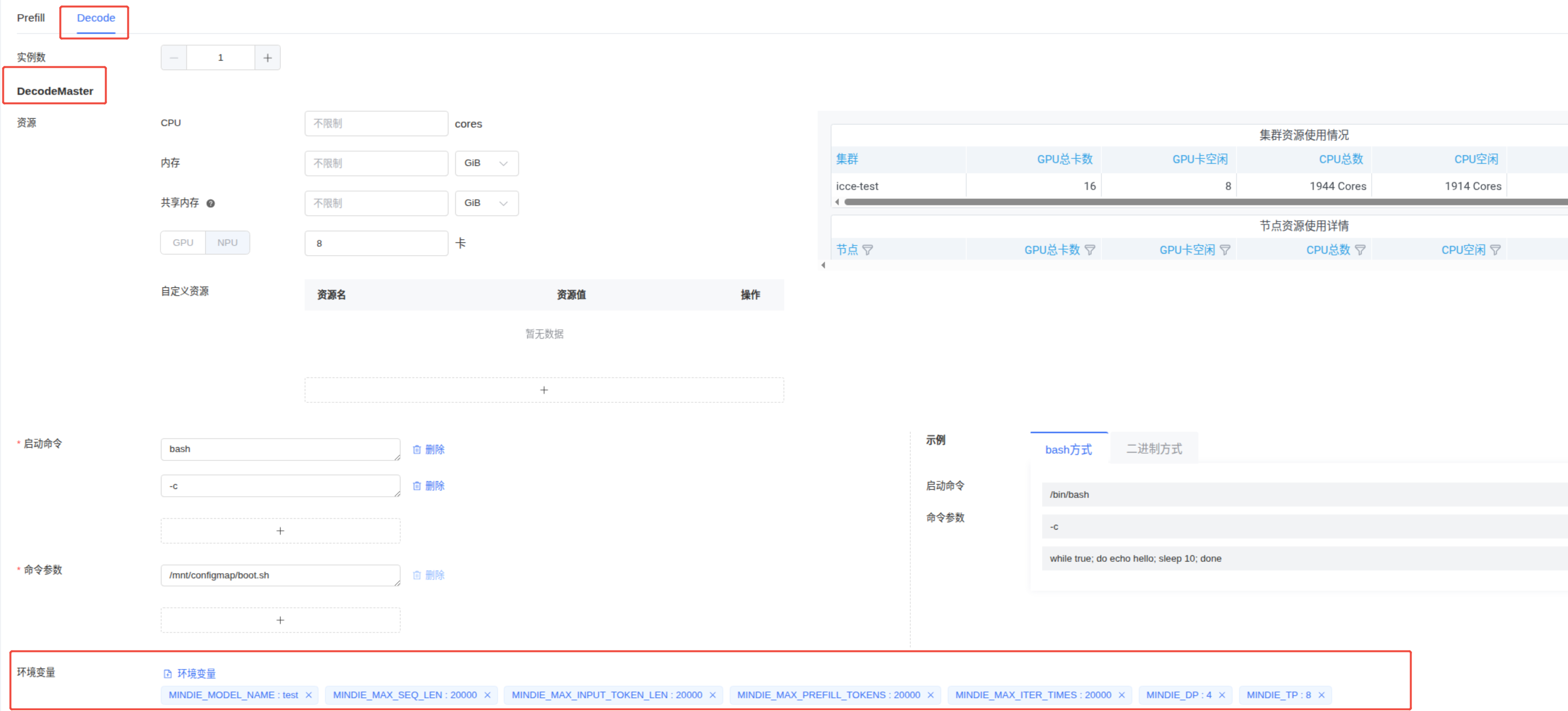 DecodeMaster 资源菜单:CPU,内存,共享内存可以不填,NPU填:8。
