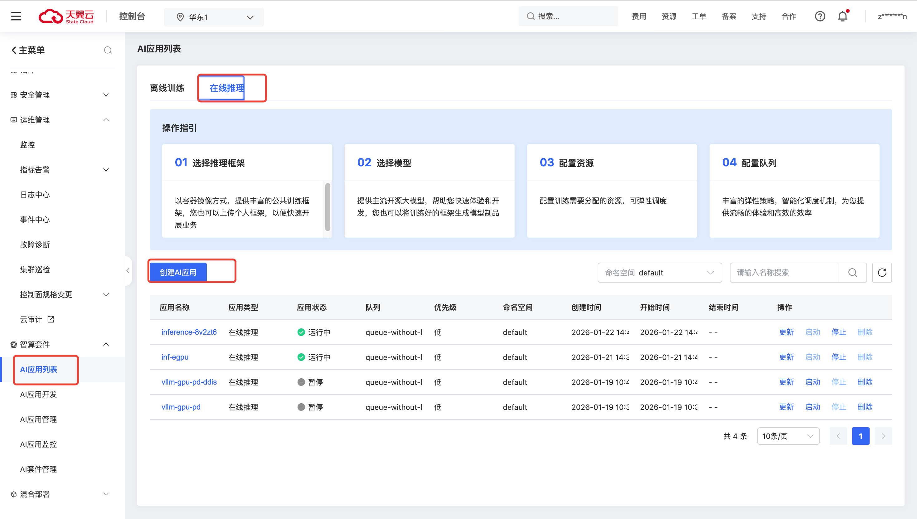 进入智算套件,AI应用列表,在线推理菜单,创建AI应用。
