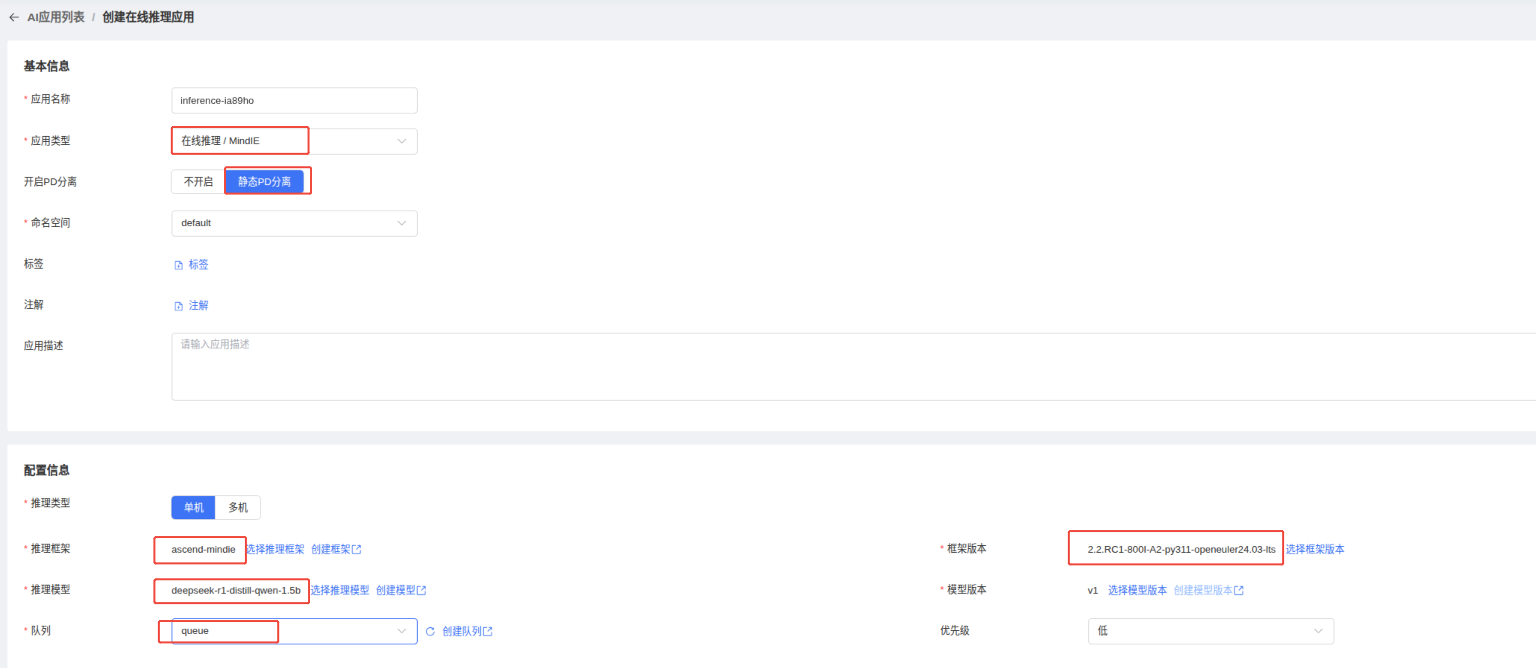 推理类型选择单机,推理框架,框架版本,推理模型,模型版本根据实际情况选择。简单的示例: