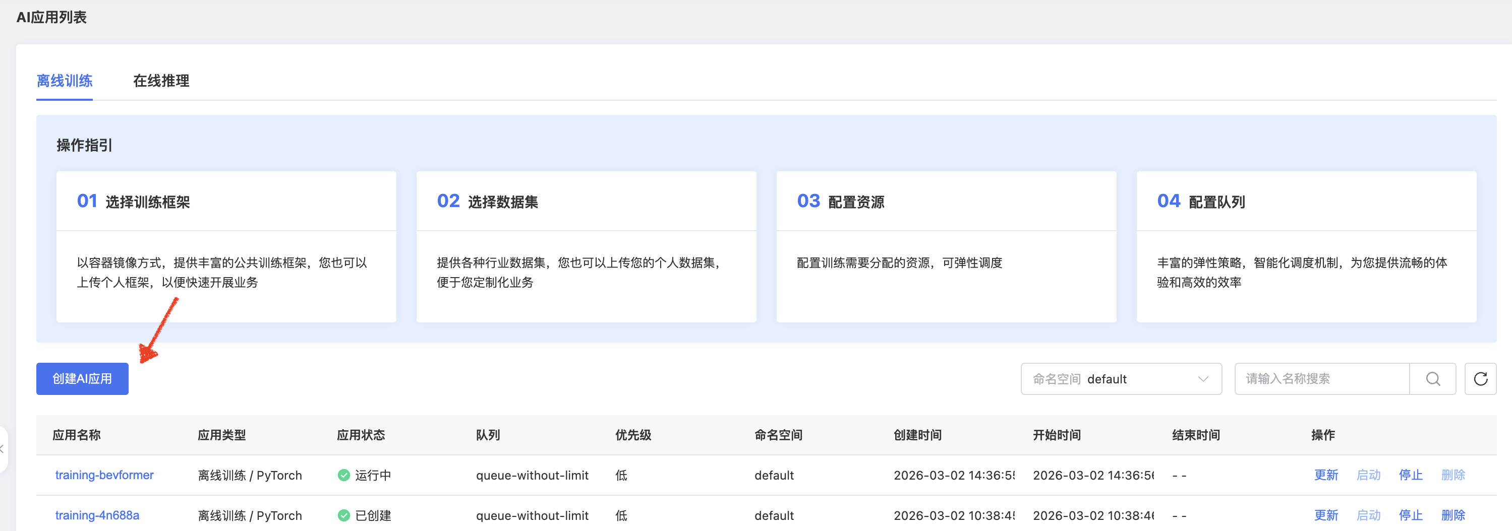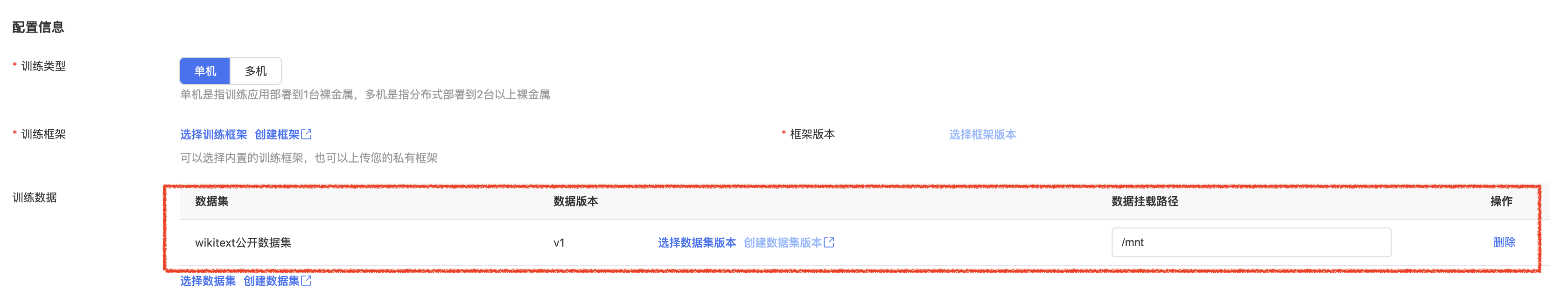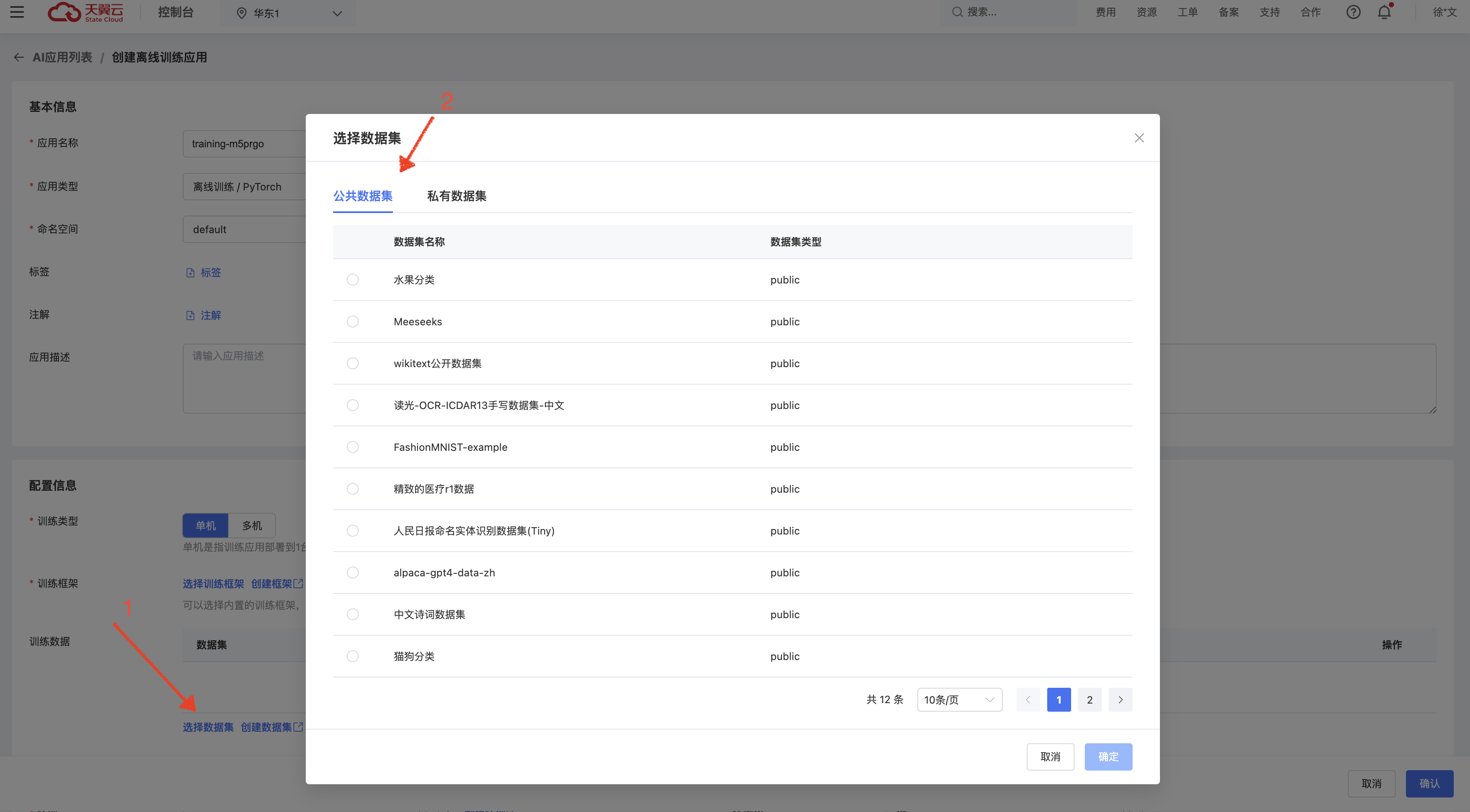 在离线训练创建过程,可以使用已有数据集,包括公共数据集和私有数据集。