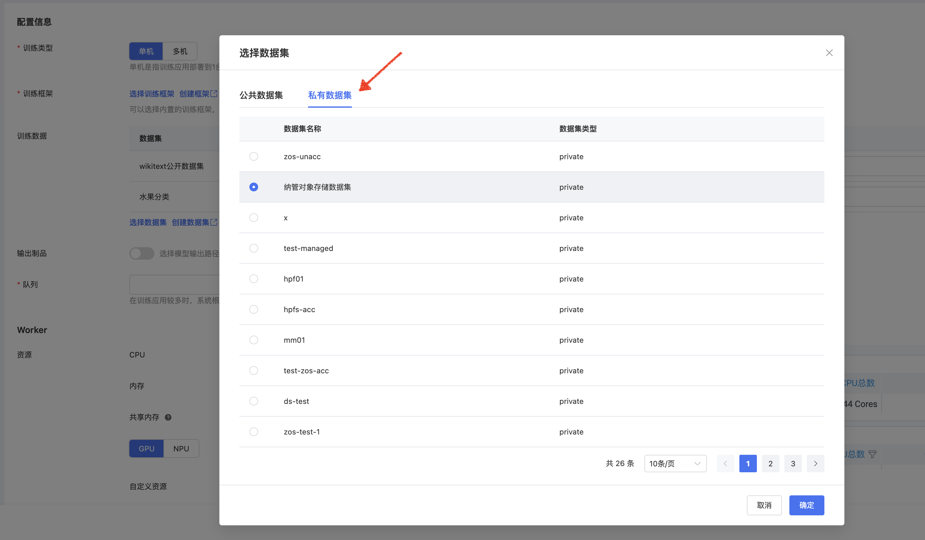 私有数据集在选择数据集时,需点击私有数据集进行选择,其余操作和公共数据集一致。