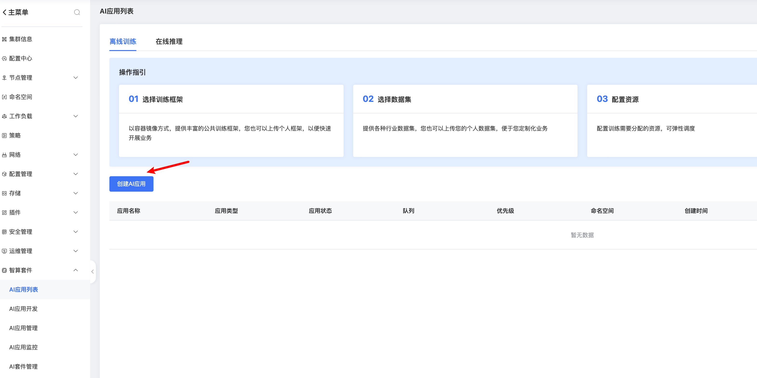 一、进入 智算套件 - AI应用列表 - 离线训练,点击 创建AI应用