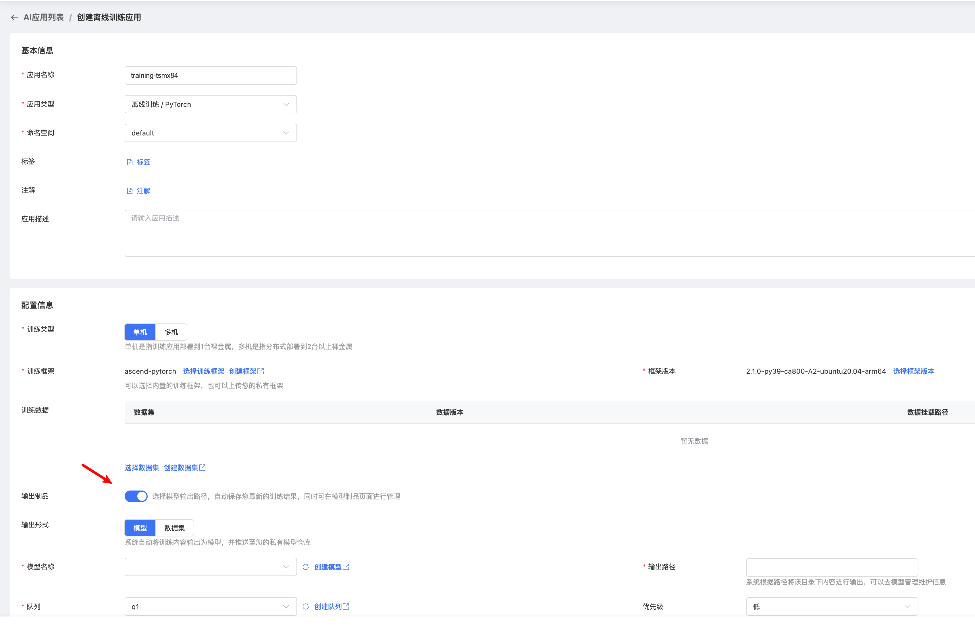 二、填入 应用名称, 选择应用类别、命名空间、训练类型和训练框架,打开 输出制品 按钮,输出形式选择 模型,选择 模型名称 和 模型输出路径。