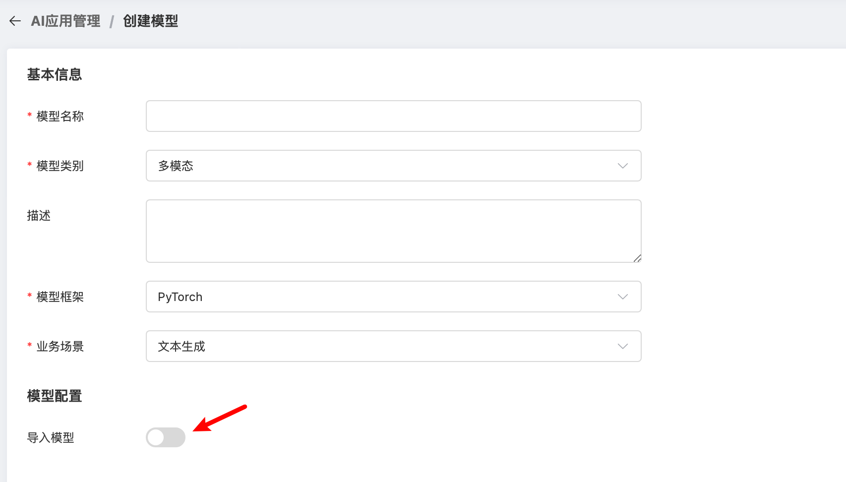 创建空模型:点击 创建模型,填写 模型名称,选择 模型类别、模型框架、业务场景,同时关闭 导入模型 按钮