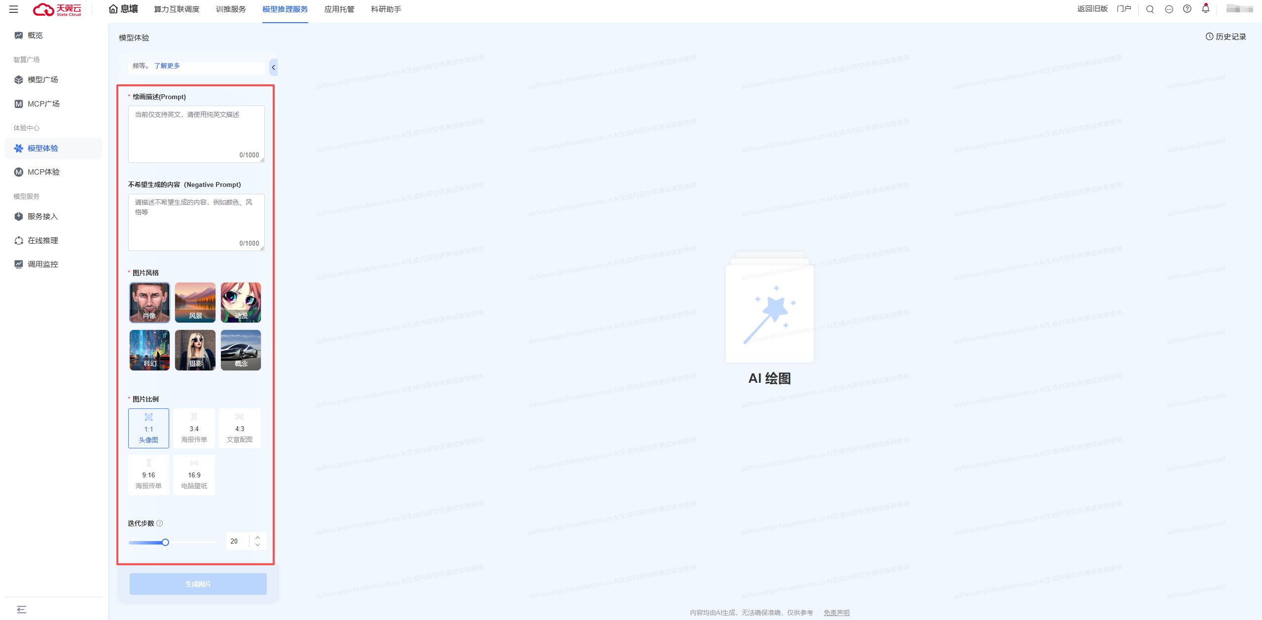 - 文本生图类模型支持设置绘画描述、图片风格、图片比列和迭代步数等参数。