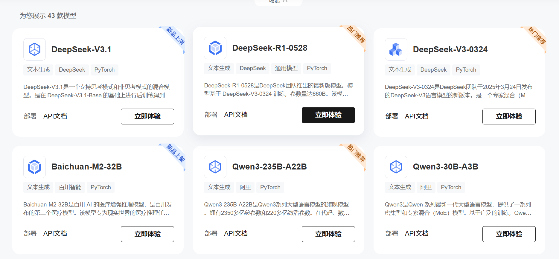 2.选择目标模型,点击【立即体验】进入模型体验中心。