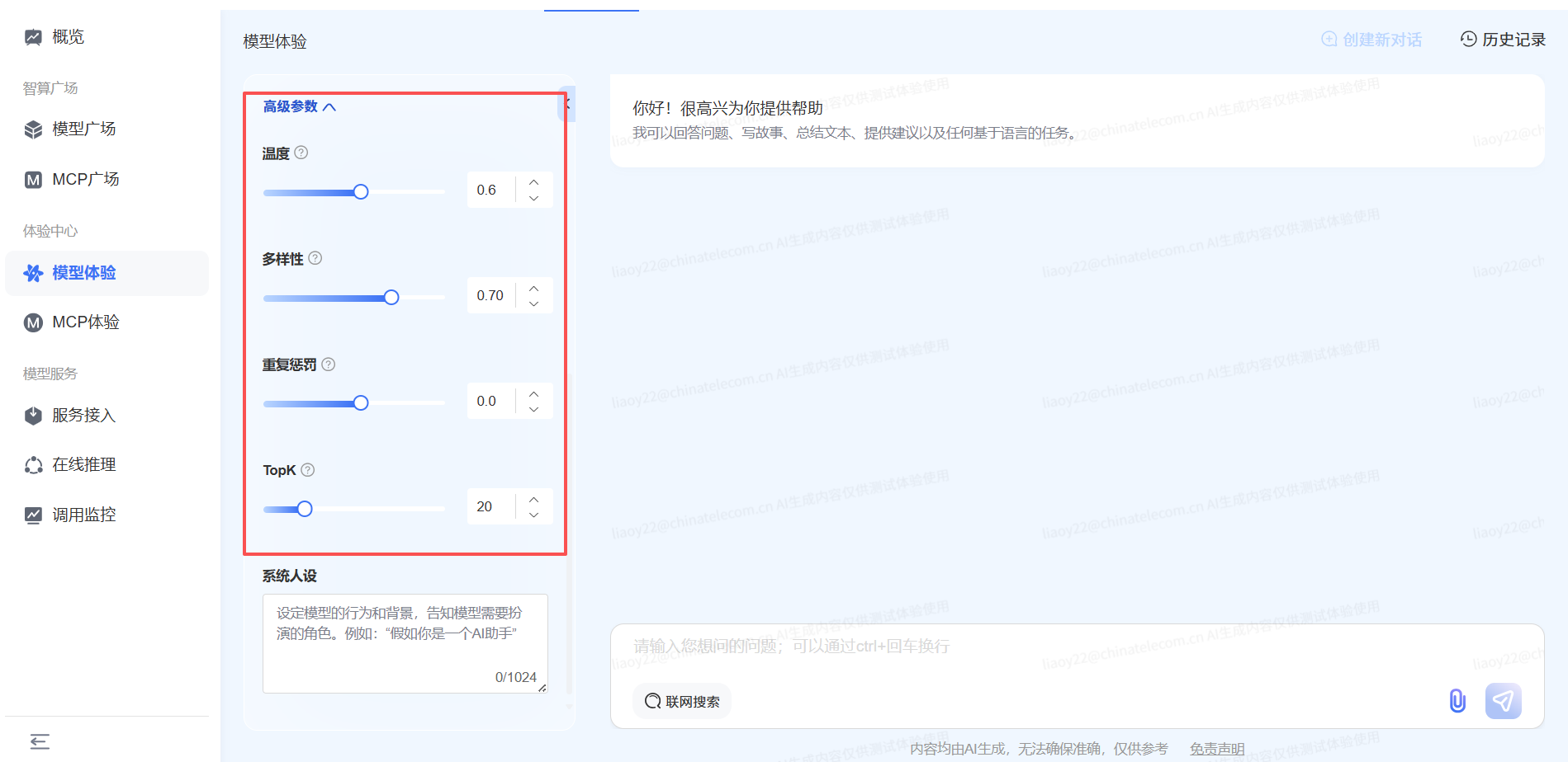 - 文本生成类模型支持调整模温度、多样性等参数设置。
