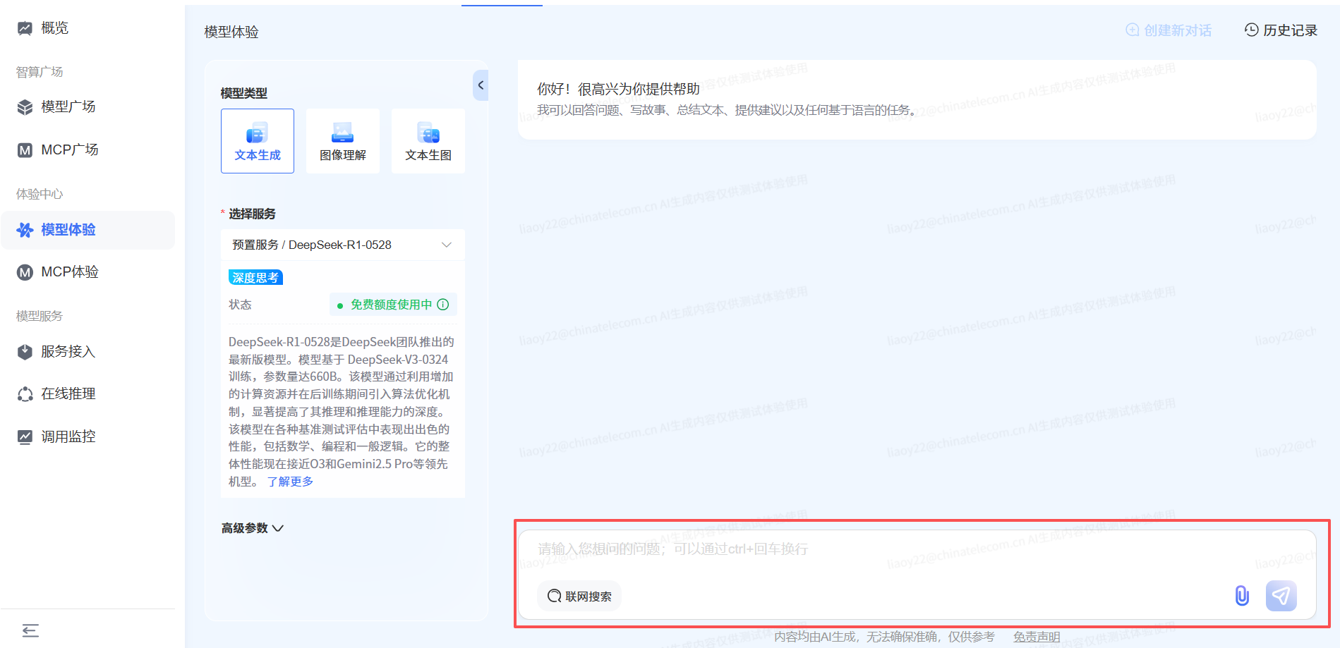 4.在对话中输入问题即可查看返回结果,体验模型的性能和效果。