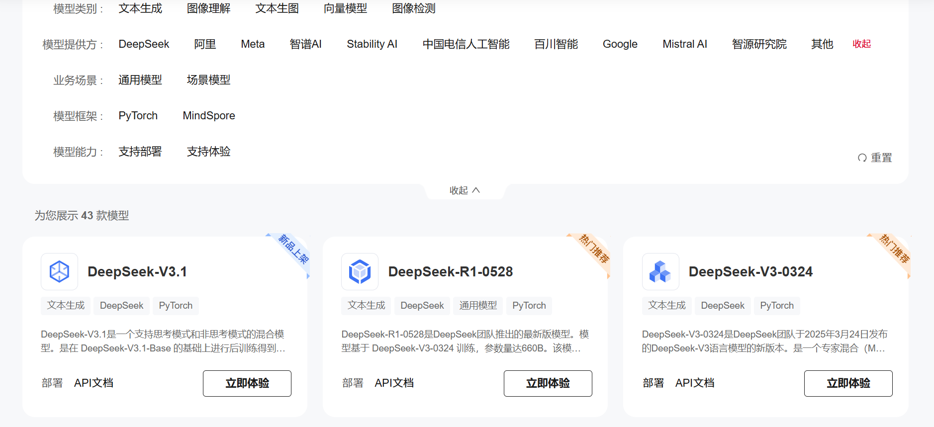 1.进入【模型市场】,可通过模型类别、模型提供方、模型框架等查询条件筛选模型。