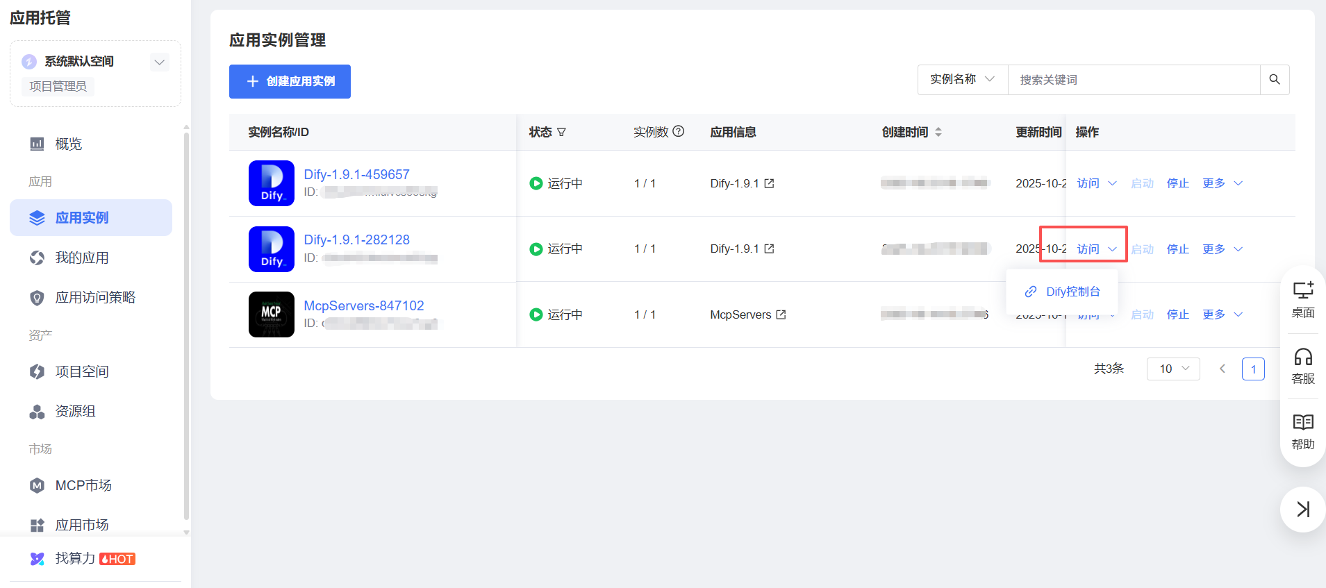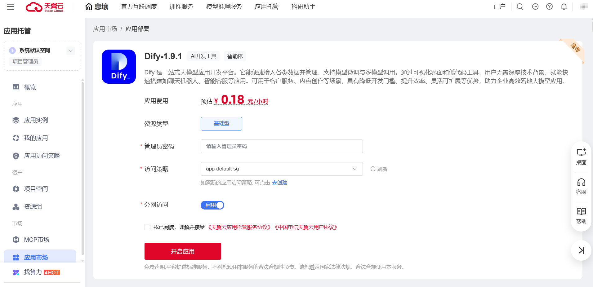 2.选择应用点击对应的【开启应用】按钮,进入应用详情页。以Dify-1.9.1为例: