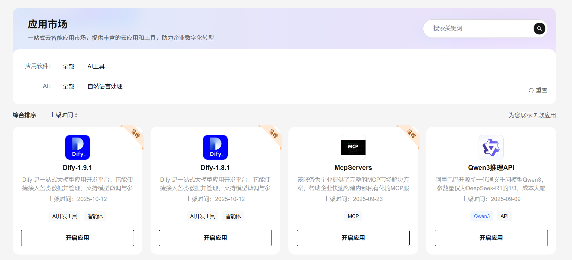1.进入【应用市场】,可通过查询条件筛选列表中的应用。