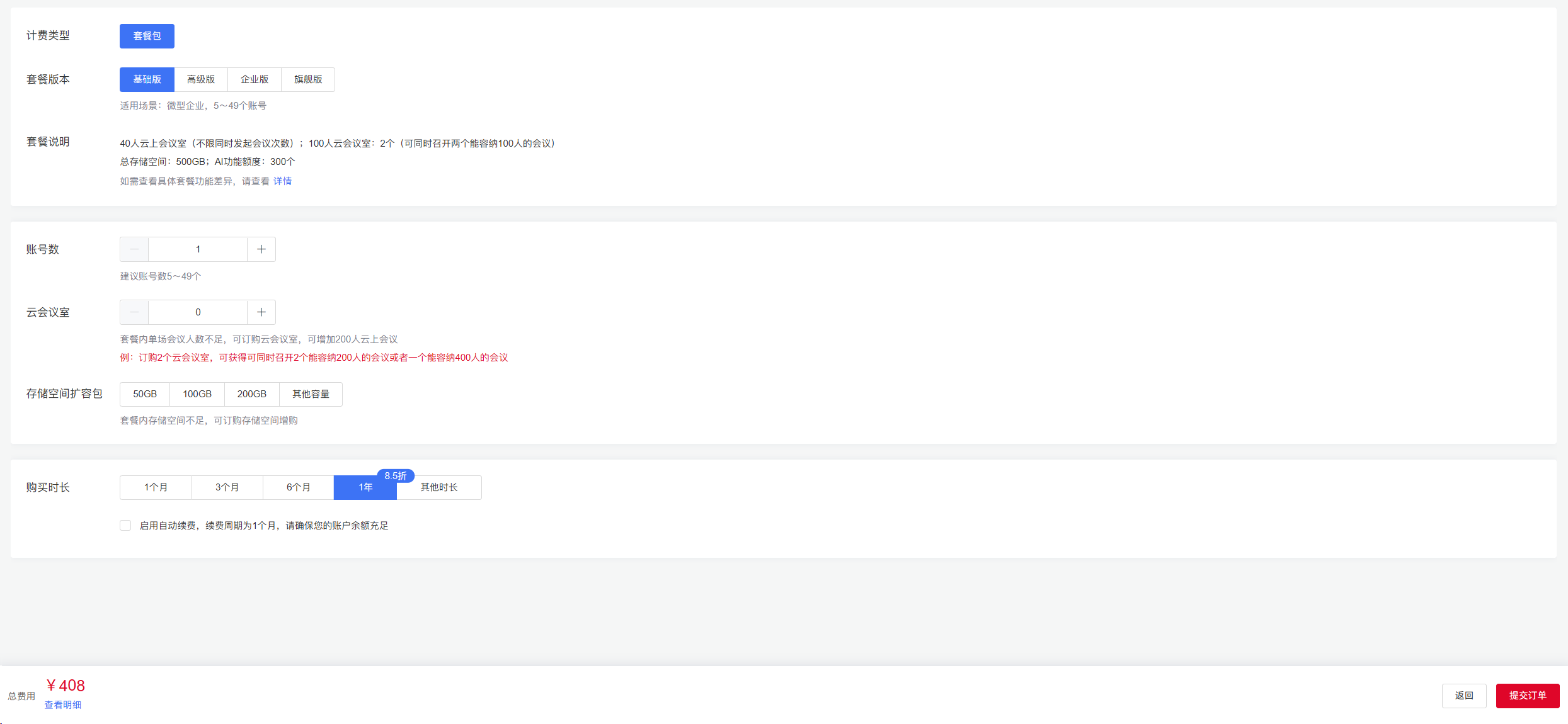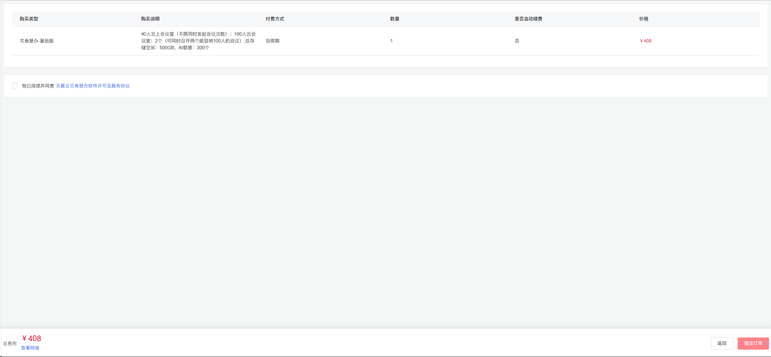 在购买页面选择适合的套餐和扩展服务,阅读并勾选服务协议,确认无误后点击【立即支付】,花卷慧办服务即开通。