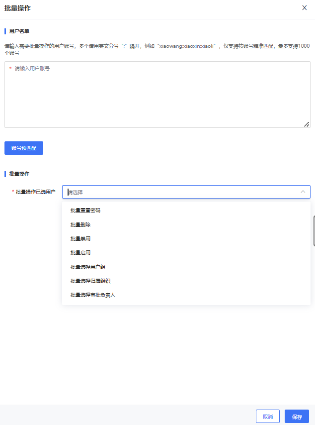 | 账号 | 必填,用于登录和唯一标识的账号,不可修改,可包含数字、符号(仅支持“_” 、“.”、“-”、“·”),不允许企业内账号重复。 | |