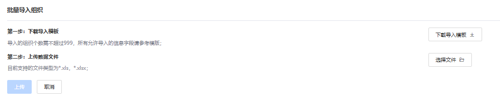 先下载导入模板,填写完成后进行文件上传,再点击“确定”按钮即可实现组织批量导入。