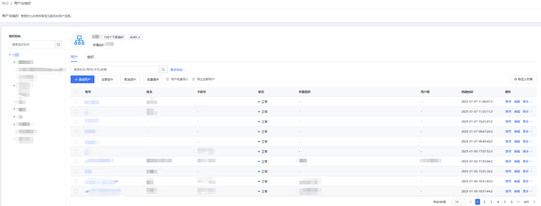 在左侧导航栏身份-用户与组织,查看并处理用户与组织配置。