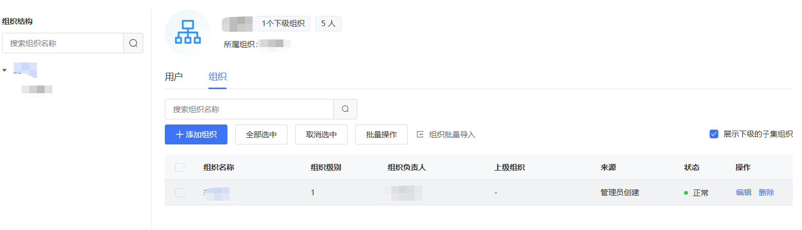 | 归属组织 | 勾选归属组织,默认位置为您的根组织节点,组织信息来源于组织分页管理的组织列表。 | 若使用批量导入用户功能,则此字段需要填写组织全路径,不同级别组织之间使用“|”分隔,例如xx一级组织|xx二级组织。 |