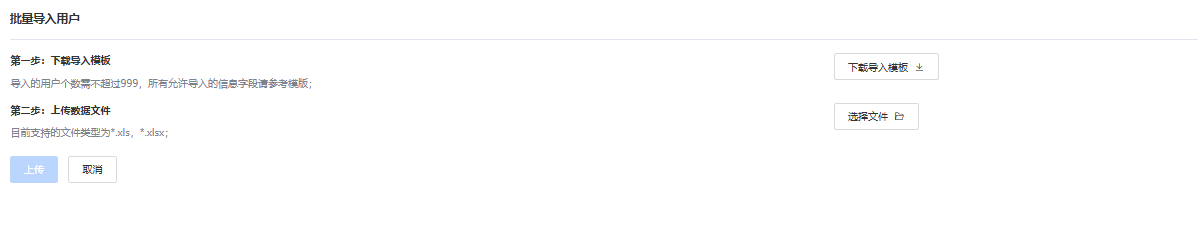 先下载导入模板,填写完成后进行文件上传,再点击“确定”按钮即可实现用户的批量导入。